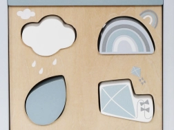- Комплект форми: Съдържа различни форми и цветове, които детето може да поставя в съответните отвори, подпомагайки разпознаването на форми и зрително-двигателната координация.