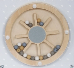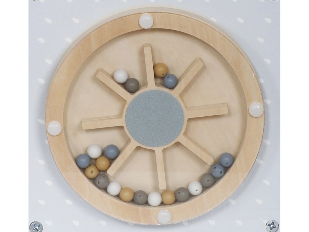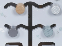 - Горна част: Съдържа релси с мъниста върху телени контури, които помагат на детето да тренира прецизни движения на ръцете и концентрация.