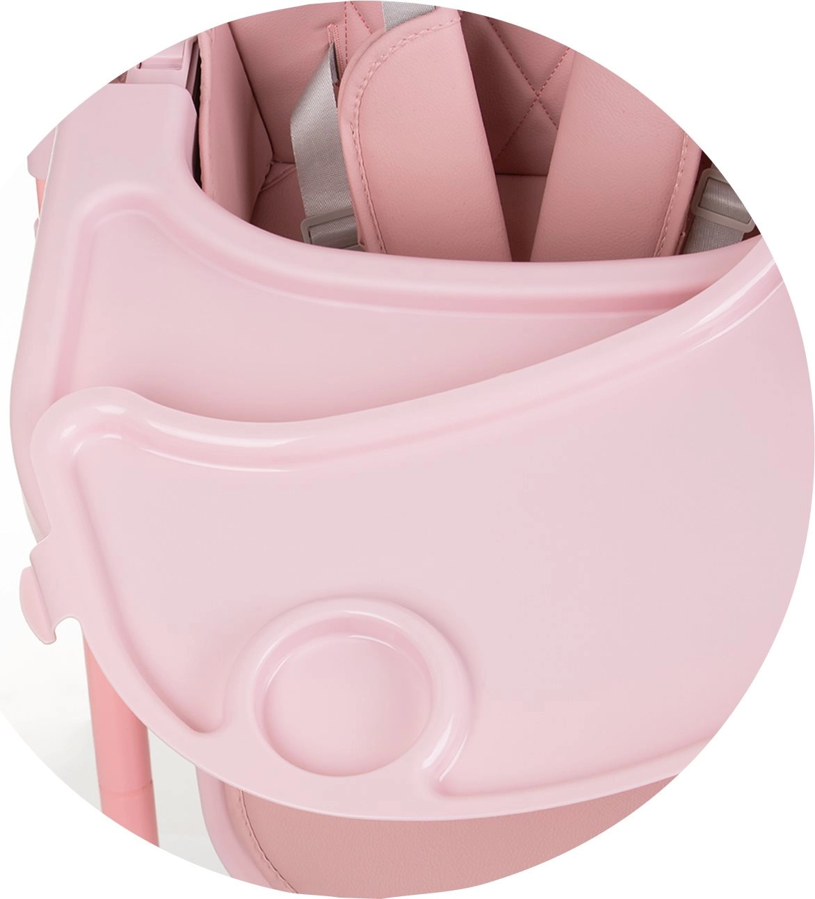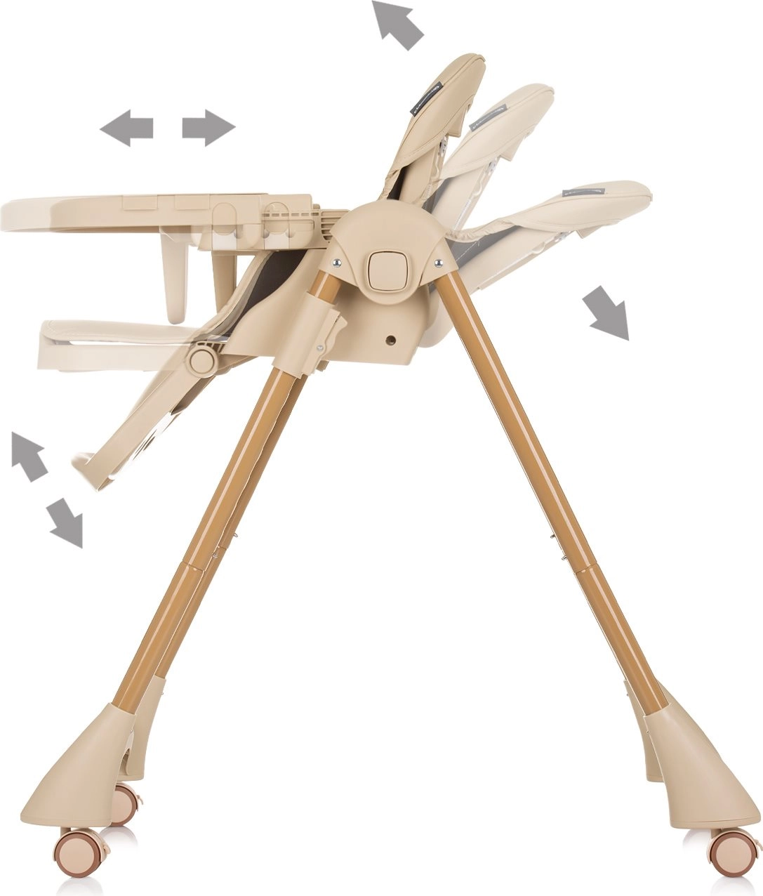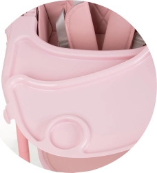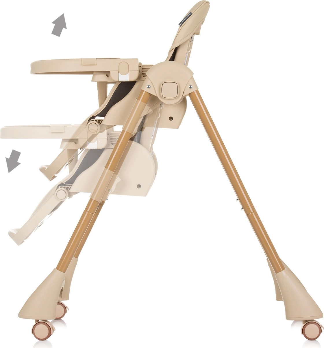 Горната табла е сваляща се за бързо почистване, а долната с Т-образна предпазна щанга държи детето в безопасна позиция. Таблата се регулира напред/назад в 3 позиции.