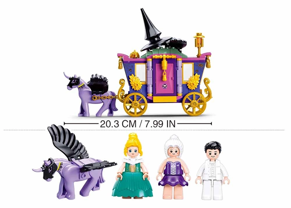 Елементите са изработени от висококачествена, безопасна и издръжлива ABS пластмаса и са напълно съвместими с популярни конструктори. В кутията ще намерите ясен наръчник, с който ще построите каляска с дължина приблизително 20 см, както и тематични аксесоари за вълшебни сценки.