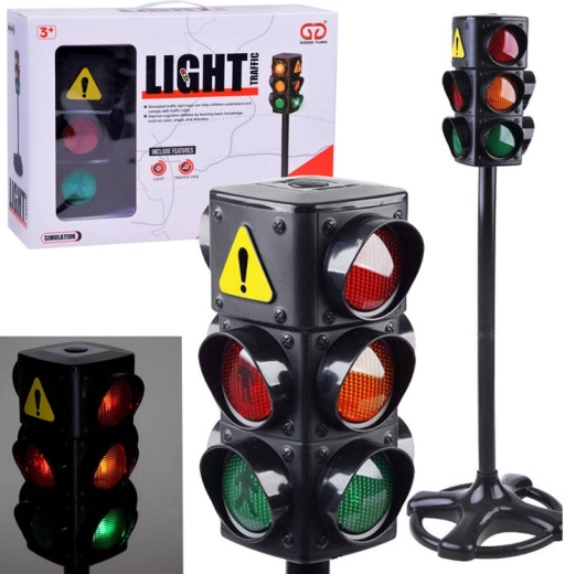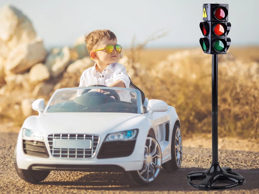 Реалистичен детски светофар с червена, оранжева и зелена светлина и звукови ефекти учи децата на правилата за движение по пътищата по забавен начин. Идеален за игра с колела за бутане и колички в двора или в детската стая, където насърчава безопасно поведение на пешеходната пътека и развитието на транспортното възпитание.