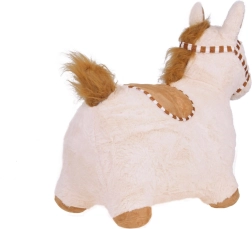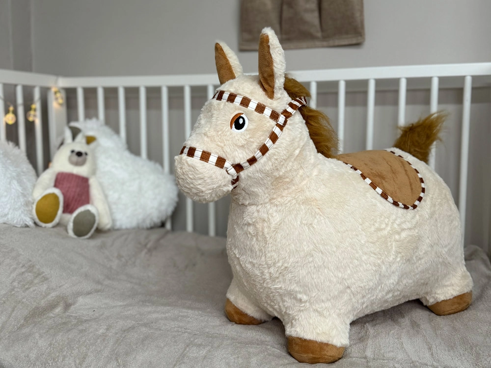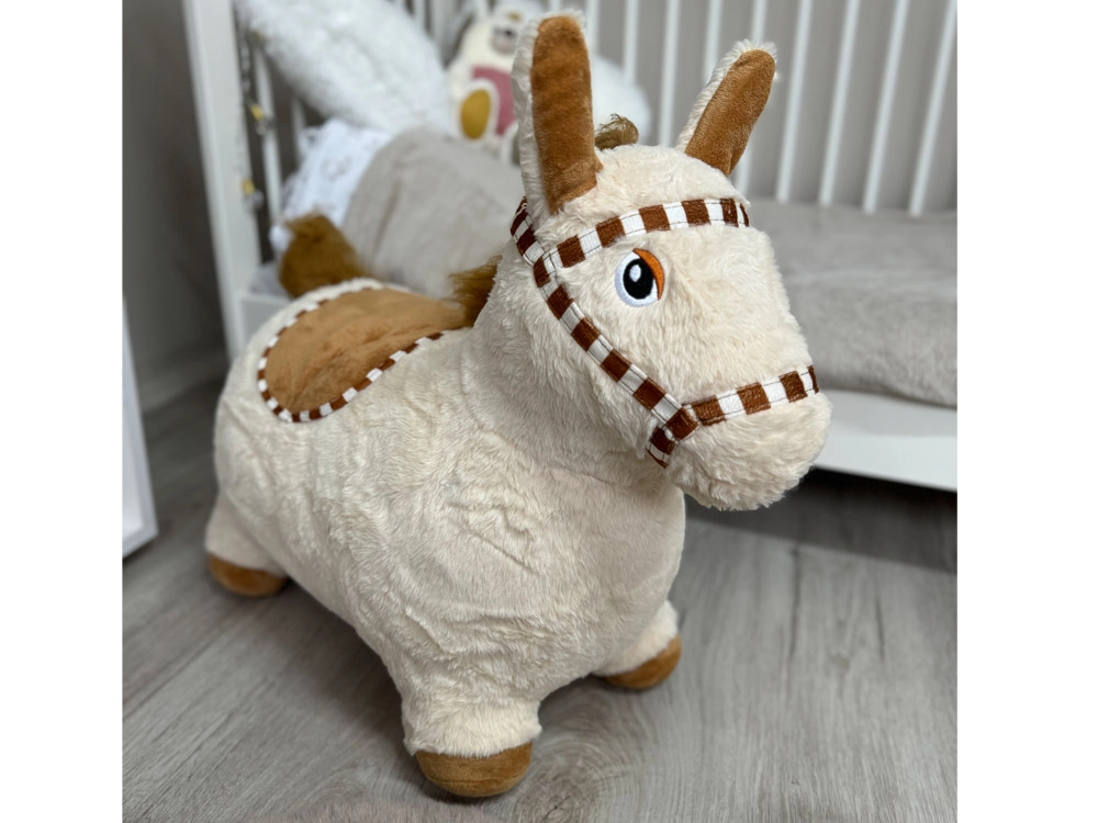 Плюшеното пони е идеалният спътник за скачане, игра и гушкане. Меката, нежна на допир повърхност е приятна, а стабилната скачаща конструкция помага на децата да тренират стабилност, моторика и мускулна сила. Ушите служат като безопасни дръжки, а свирчето между тях добавя забавен елемент към играта.