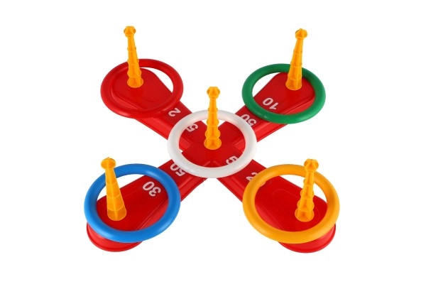 Играта включва кръстообразна основа и цветни рингове за забавно хвърляне.