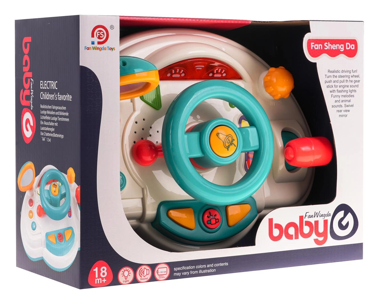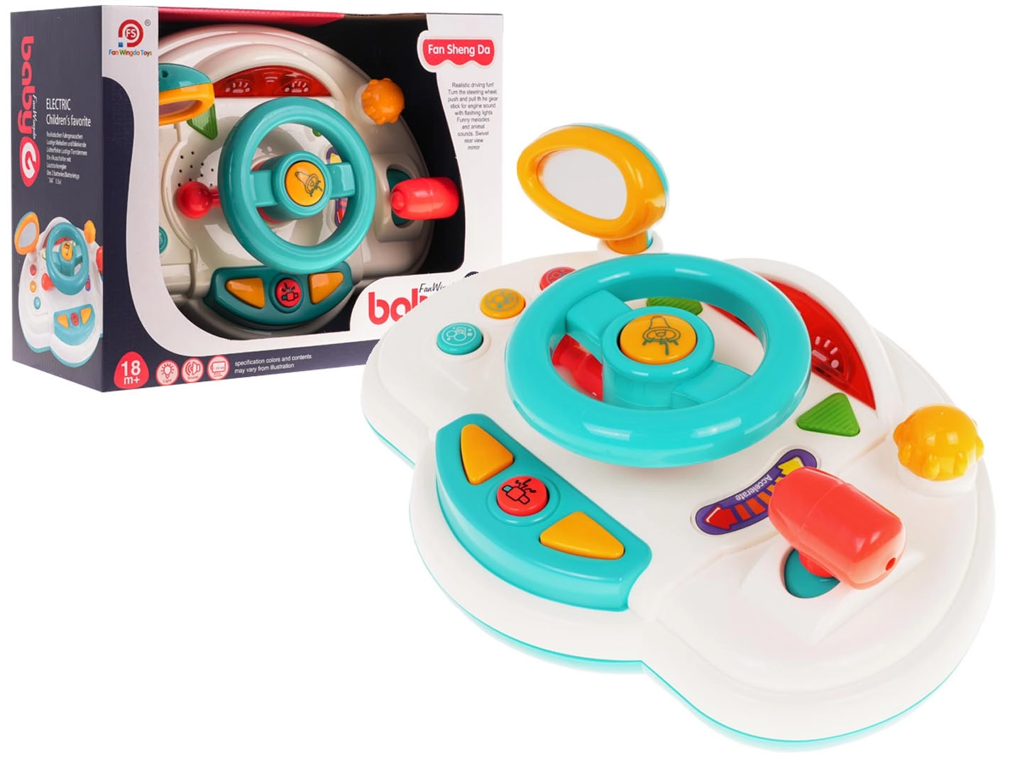 Забавен интерактивен симулатор за шофиране за деца от 18 месеца, който предлага реалистично изживяване при управление. Включва светлинни ефекти, звуци на мотор и клаксон, гласови указания на английски (turn left/right) и подвижни елементи като волан, огледало за обратно виждане и скоростен лост. Цветният дизайн и лесното управление подпомагат развитието на моториката и въображението.