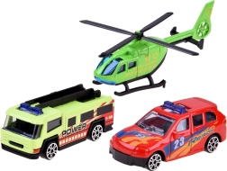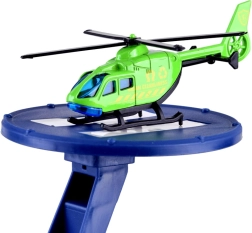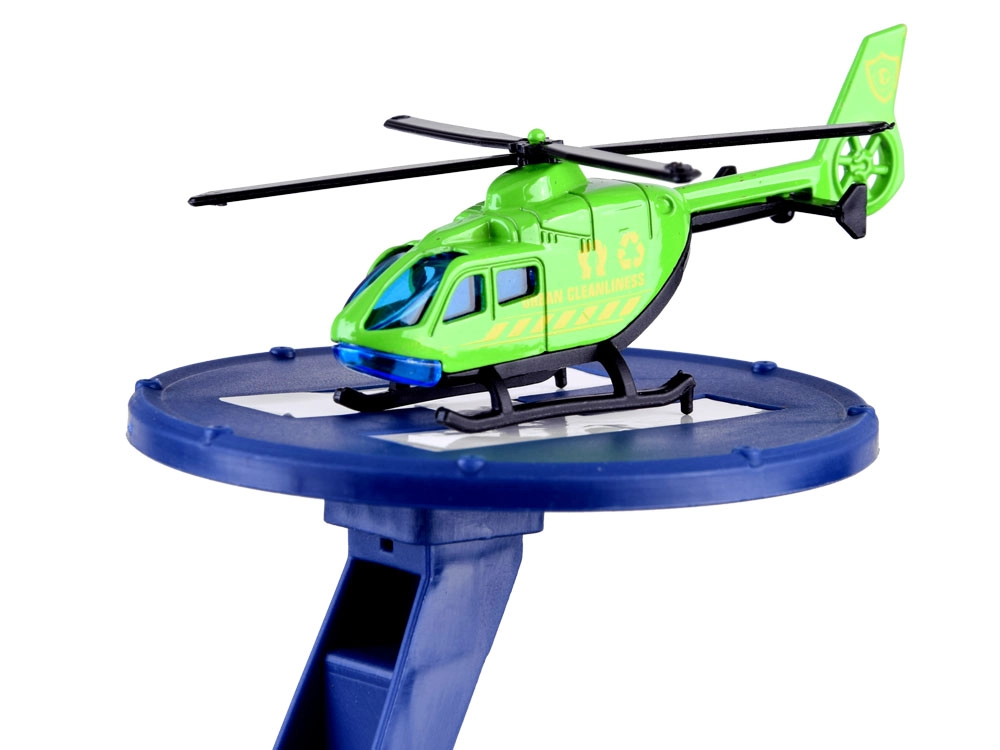 - Комплект всичко-в-едно: 2 метални колички, хеликоптер, 7 пътни знака, стикери, градска подложка.