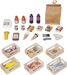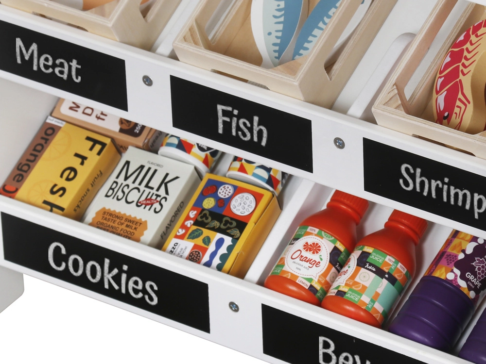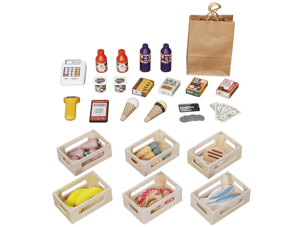 Комплектът включва каса с платежен терминал, четец, игрови пари, дървени щайги с храни, хартиена торбичка, звънец и декоративни стикери. Децата усвояват основите на сметането, финансовата грамотност и сътрудничеството, като същевременно упражняват писането и четенето върху тебеширените дъски.