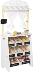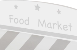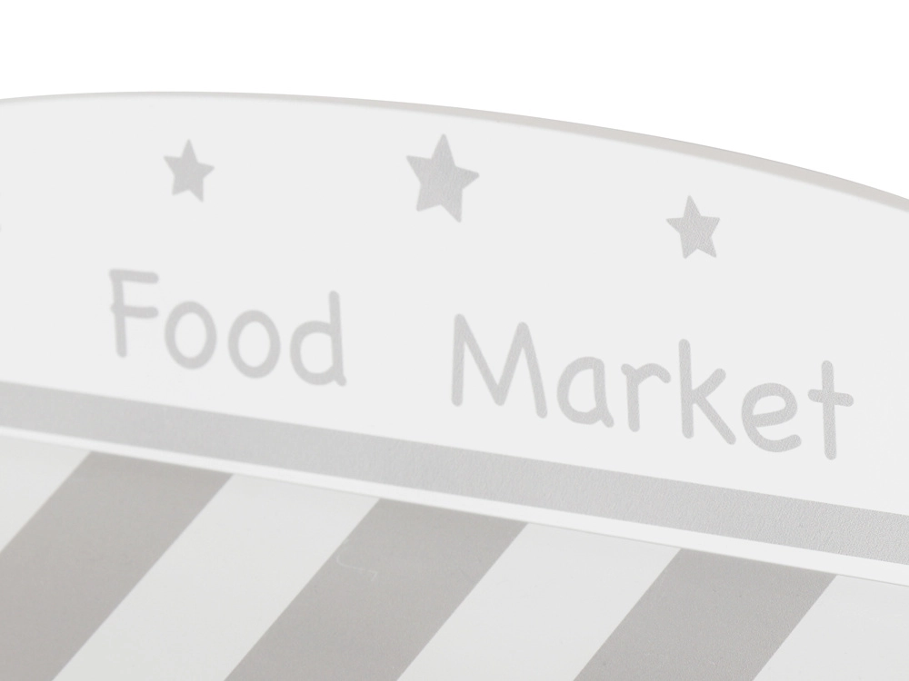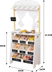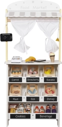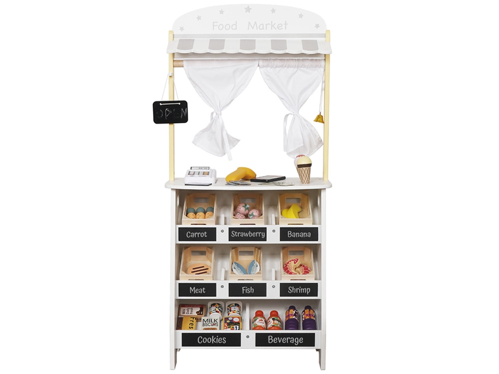 Дървеният щанд с сенник и отделения за храни предлага на децата автентично изживяване при пазаруване: сортиране на плодове и зеленчуци, писане с тебешир на дъските и маркиране през касата с четец. При завъртане или затваряне на страничните панели той се превръща в очарователен театър с завеса – идеален за първи истории и представления.