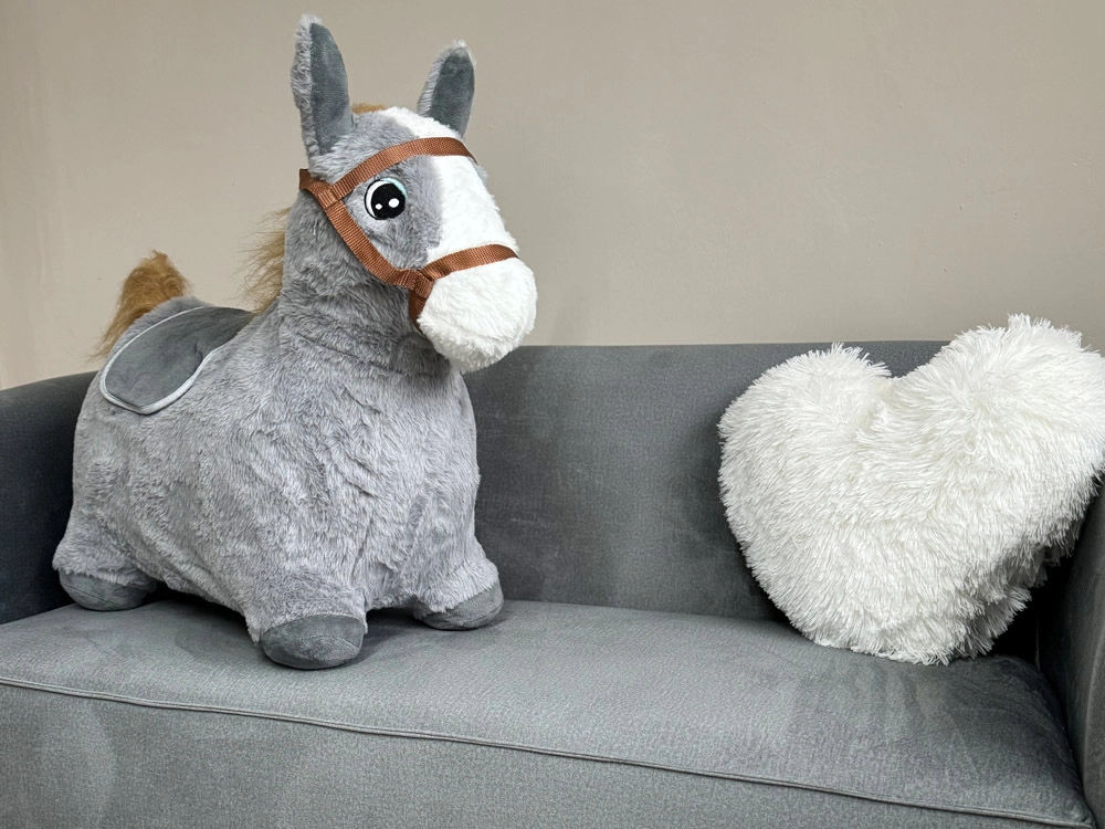 Плюшената повърхност осигурява комфорт и приканва както към гушкане, така и към активно подскачане.