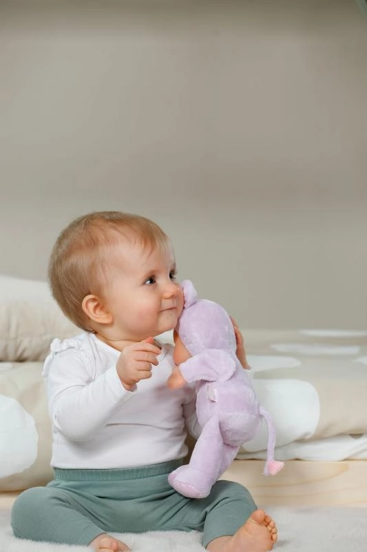 Куклата има мека винилова главичка и текстилно телце, идеална за гушкане.