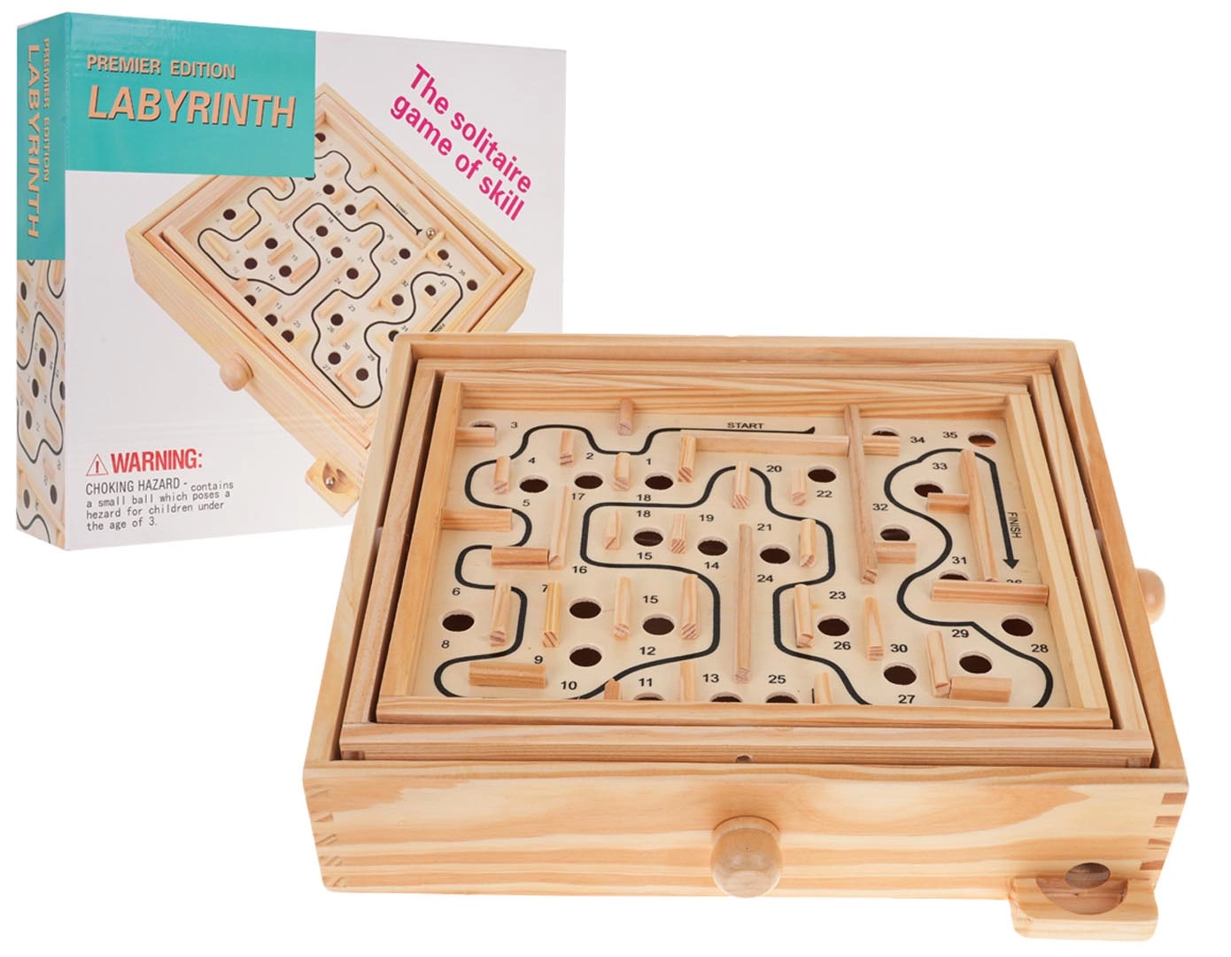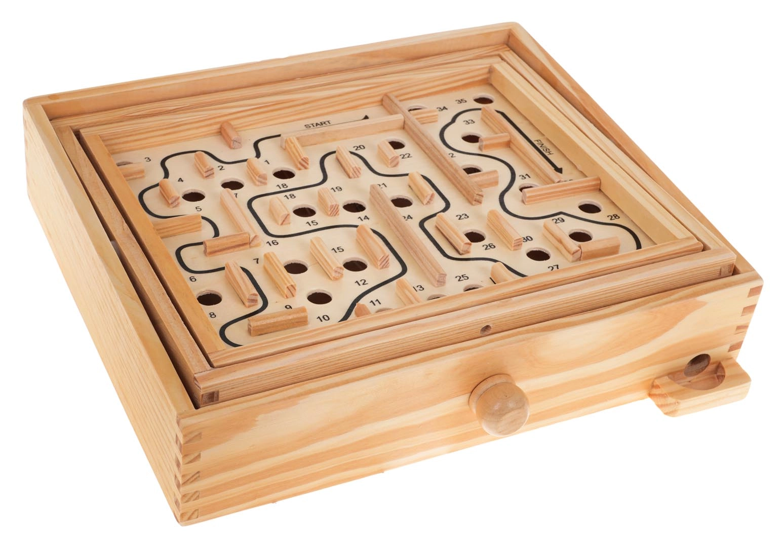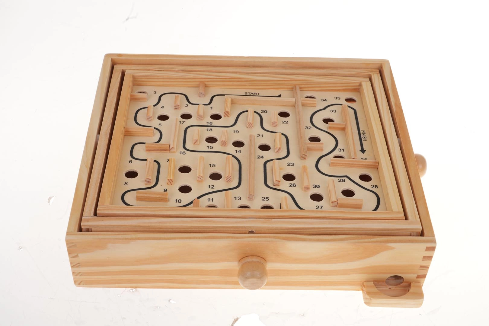 Потопете се в света на забавлението с дървената игра Лабиринт, която предлага уникално игрово изживяване и едновременно развива уменията. Тази игра е проектирана да стимулира концентрацията и координацията око-ръка. С помощта на въртящите се копчета отстрани можете лесно да накланяте игралната дъска и да насочвате топчето.