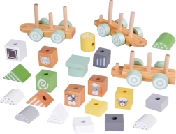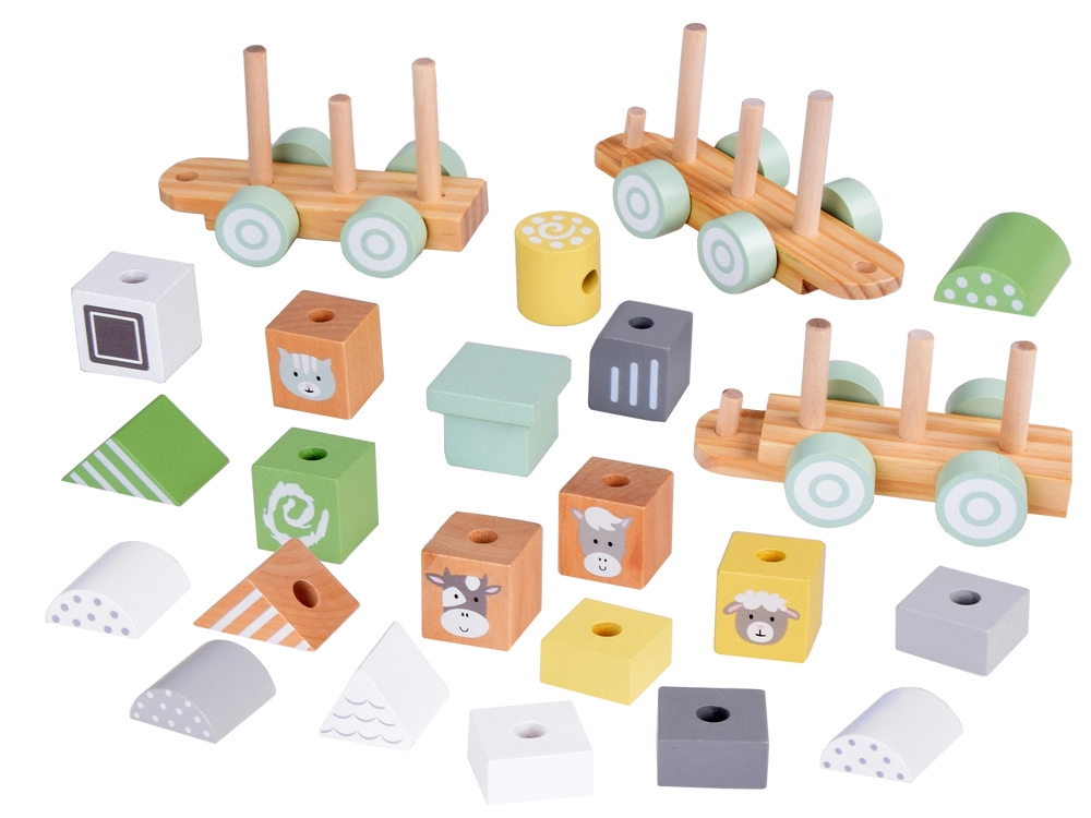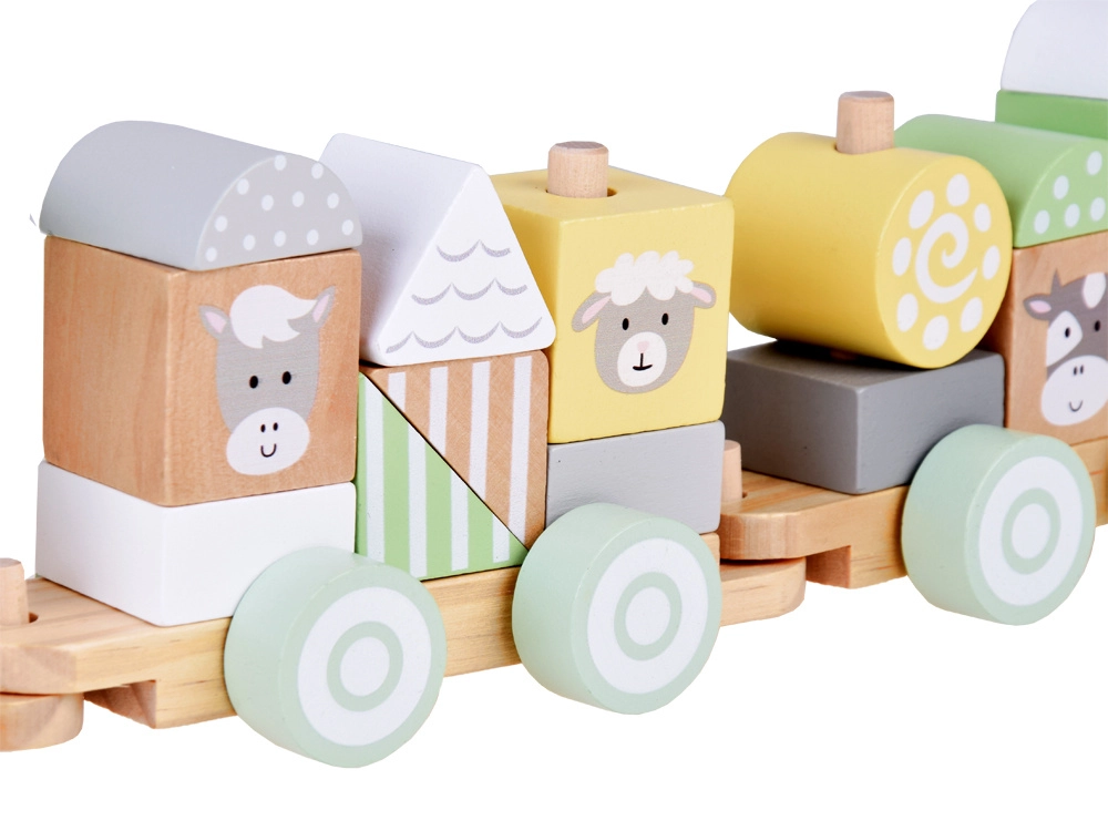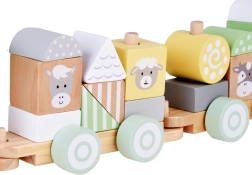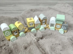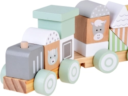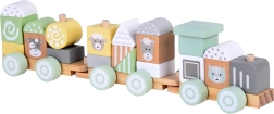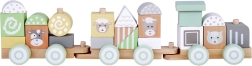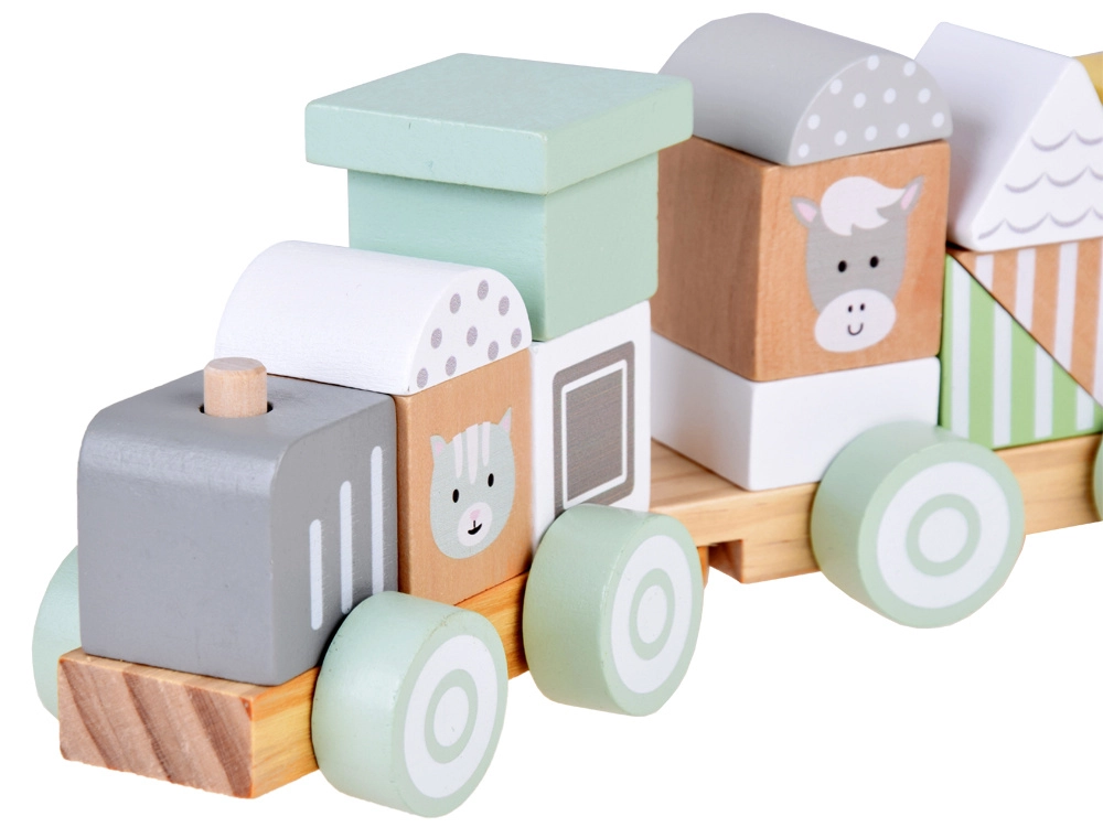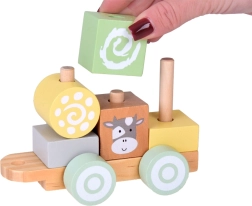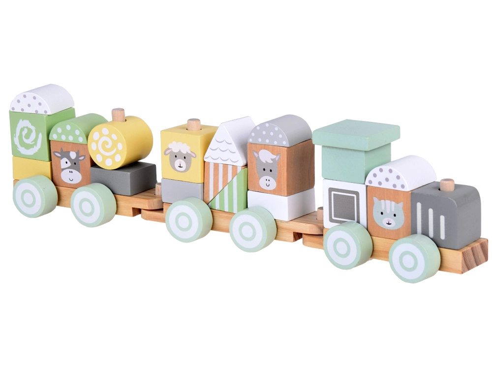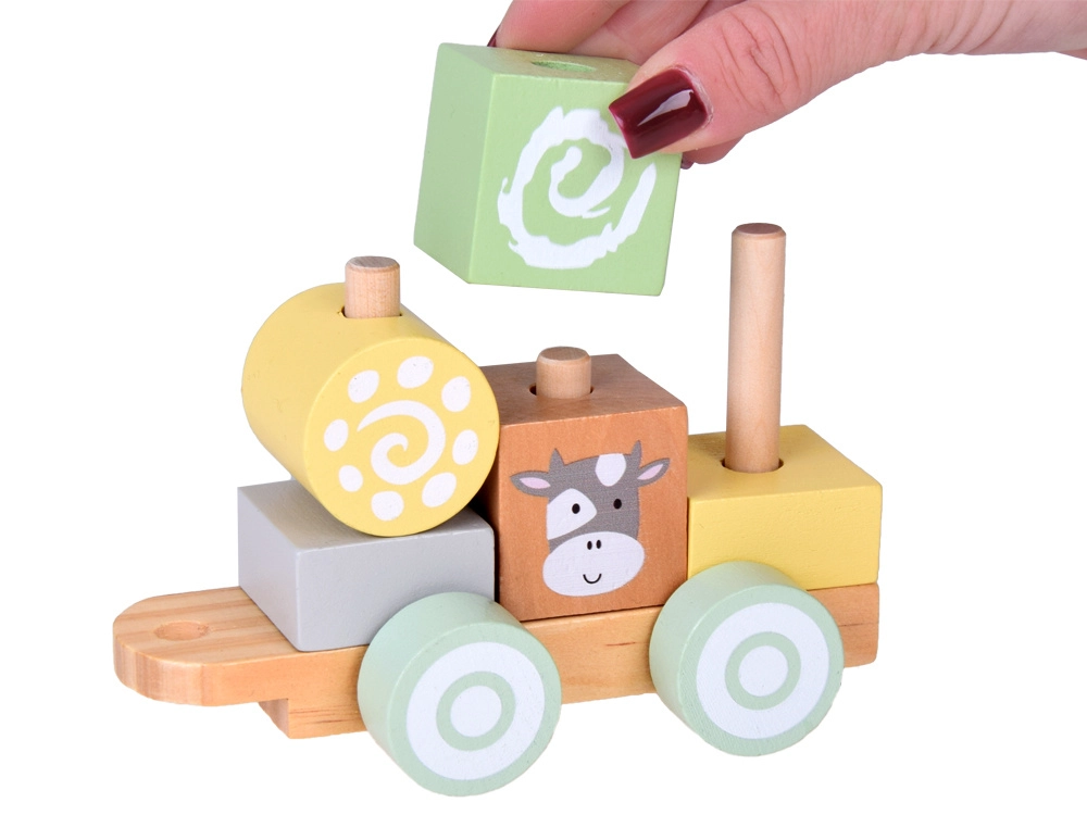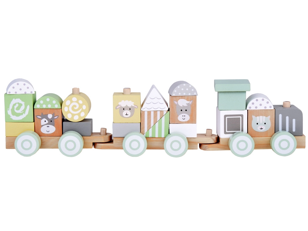 Дървеното влакче е идеална играчка за малки деца. Състои се от цветни блокчета с различни форми и животински личица като крава, овца, конче и котенце, което гарантира много привлекателно забавление. Децата могат свободно да пренареждат, подреждат и създават, като по този начин развиват своята моторика и въображение.