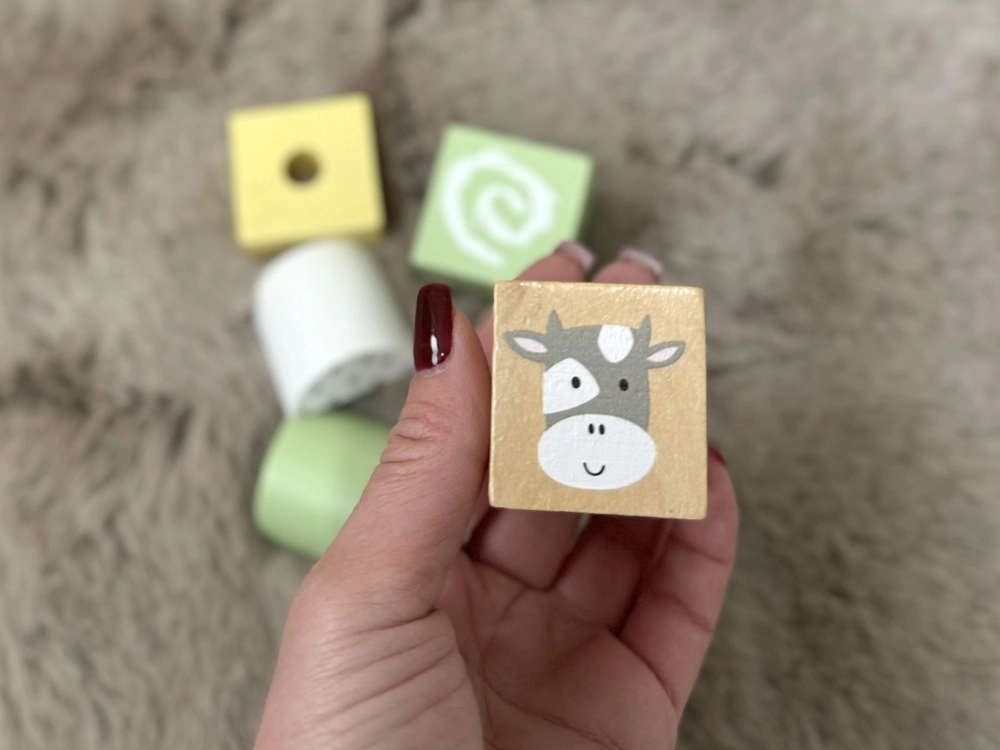 Съдържа различни блокчета с форми и шарки, които подпомагат развитието на сръчността и въображението.