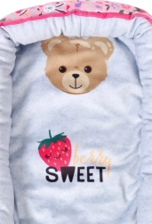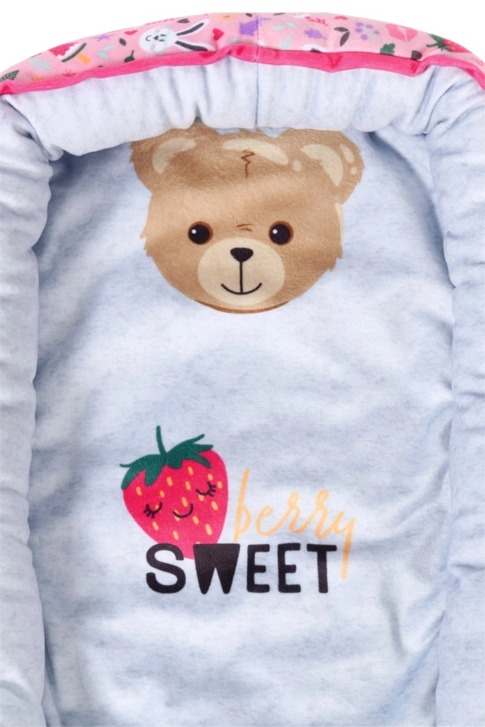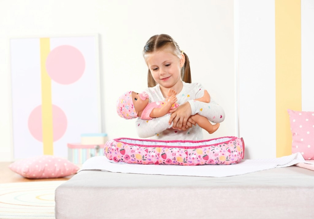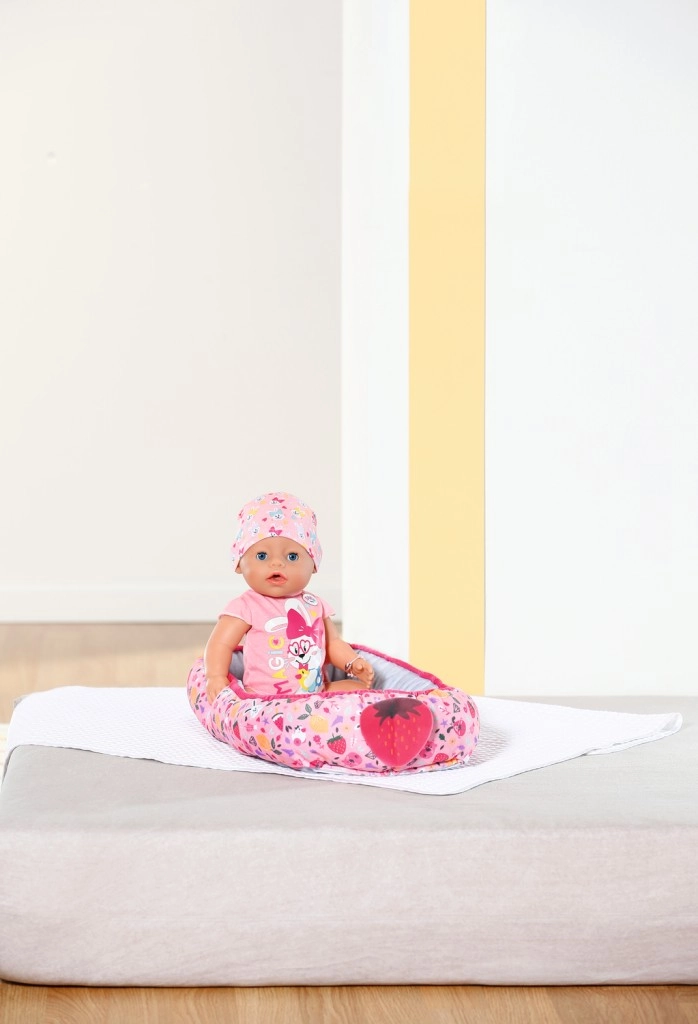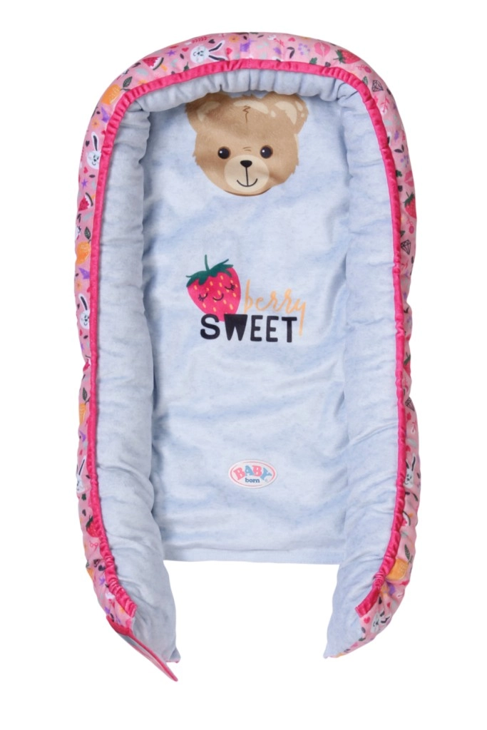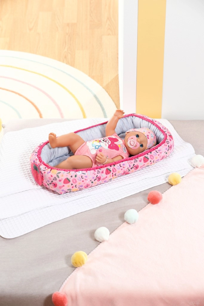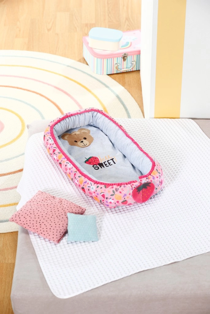 Удобно и безопасно гнездо за кукли BABY born с игрив дизайн, пълен с цветни изображения на плодове и животни. Идеален аксесоар за детската стая.