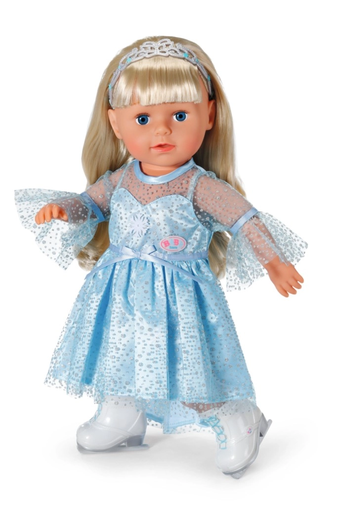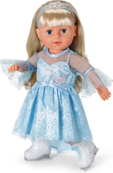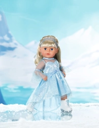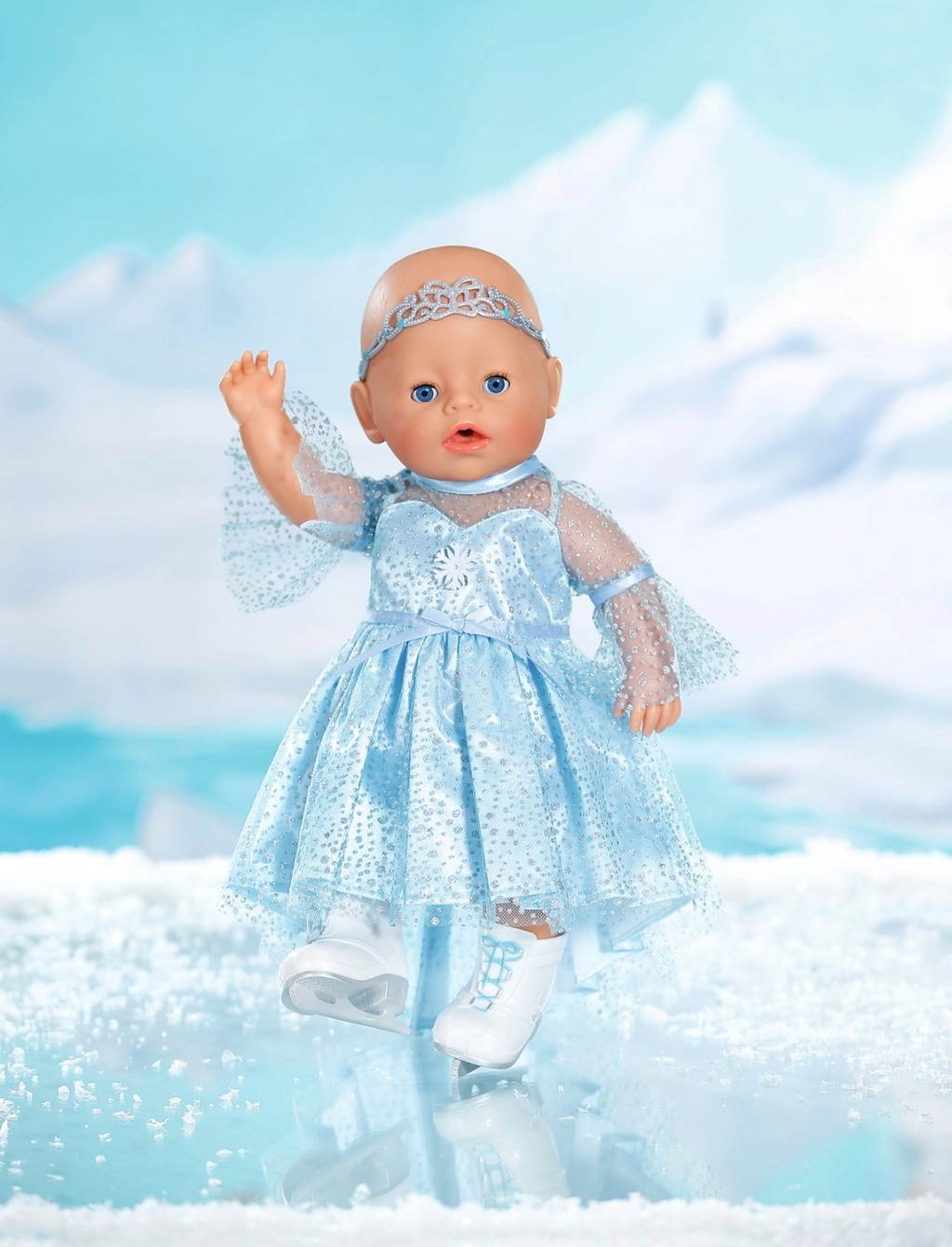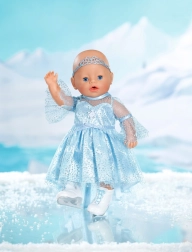 Елегантният комплект за кукли BABY born 43 см внася магията на зимното кралство в ежедневната игра. Леката блестяща рокля с фин намет се облича лесно, а благодарение на диадемата прическата стои стабилно дори при всяка пируета. Белите обувки в стил кънки подкрепят въображението и детските истории за фигурно пързаляне.