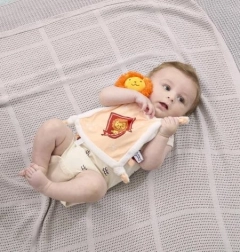 Възелчестите ъгли и меките етикетчета насърчават тактилното изследване и фината моторика. Бебето се забавлява и естествено тренира захвата.