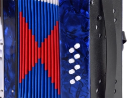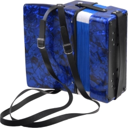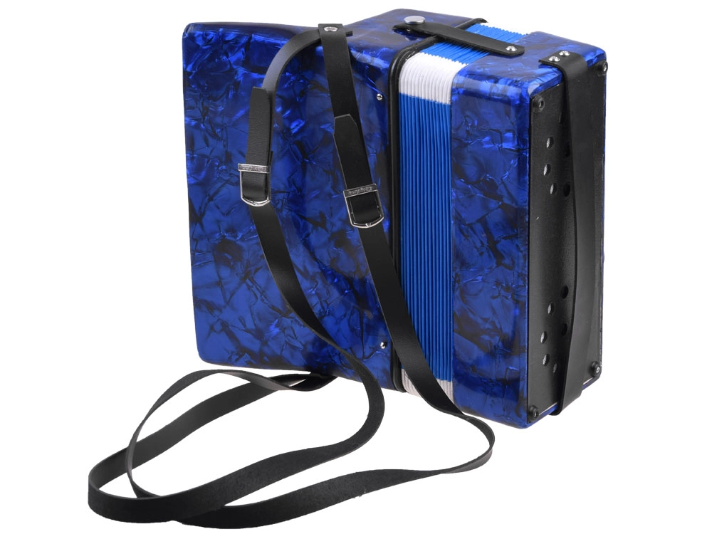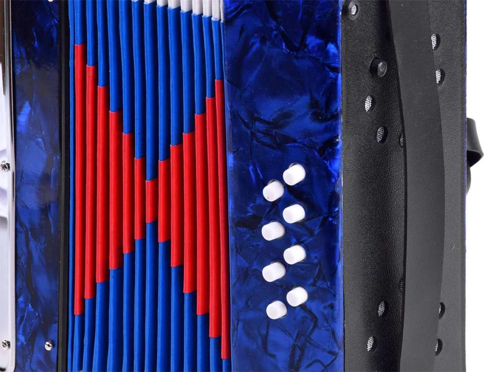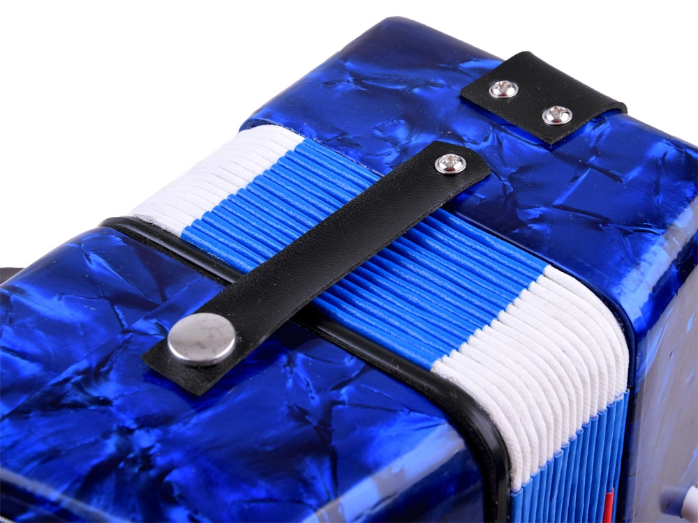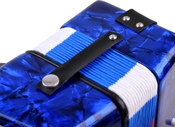 Лъскаво синьо тяло с мраморен ефект, клавиши и басови бутони. Акордеонът звучи чисто и приятно – идеален за първите музикални преживявания.