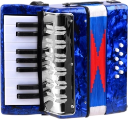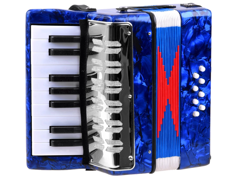 Реалистичен вид и функции – детският акордеон изглежда и функционира като истински инструмент: звукът се получава при разтягане и притискане на мяха, налични са клавиши и басови бутони. Благодарение на качествената изработка и лъскавата синя повърхност е атрактивен и издръжлив.