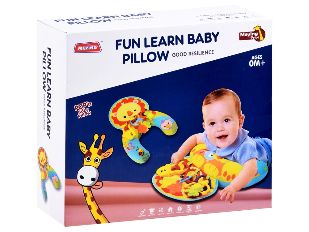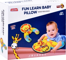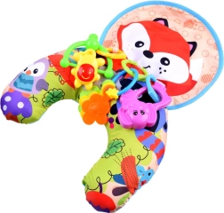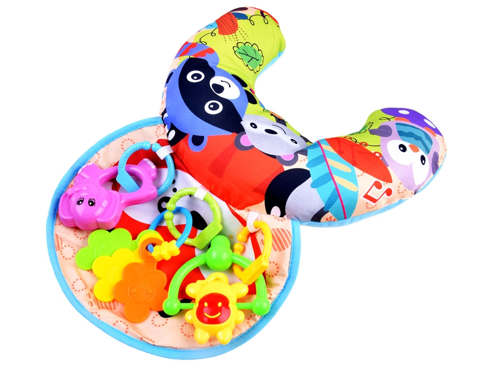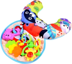 Бебето има пред себе си весели играчки, които го мотивират да повдига главичката и да укрепва гръбните мускули.