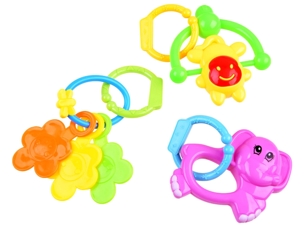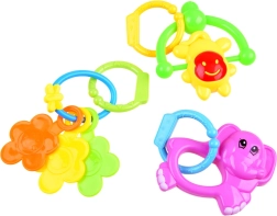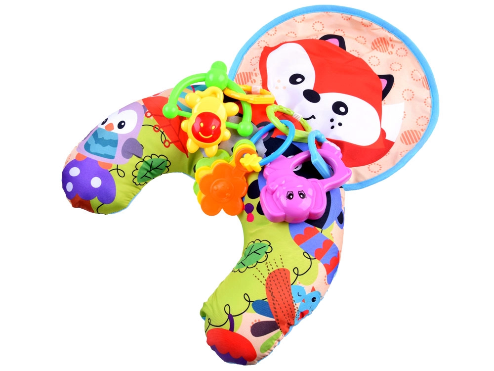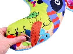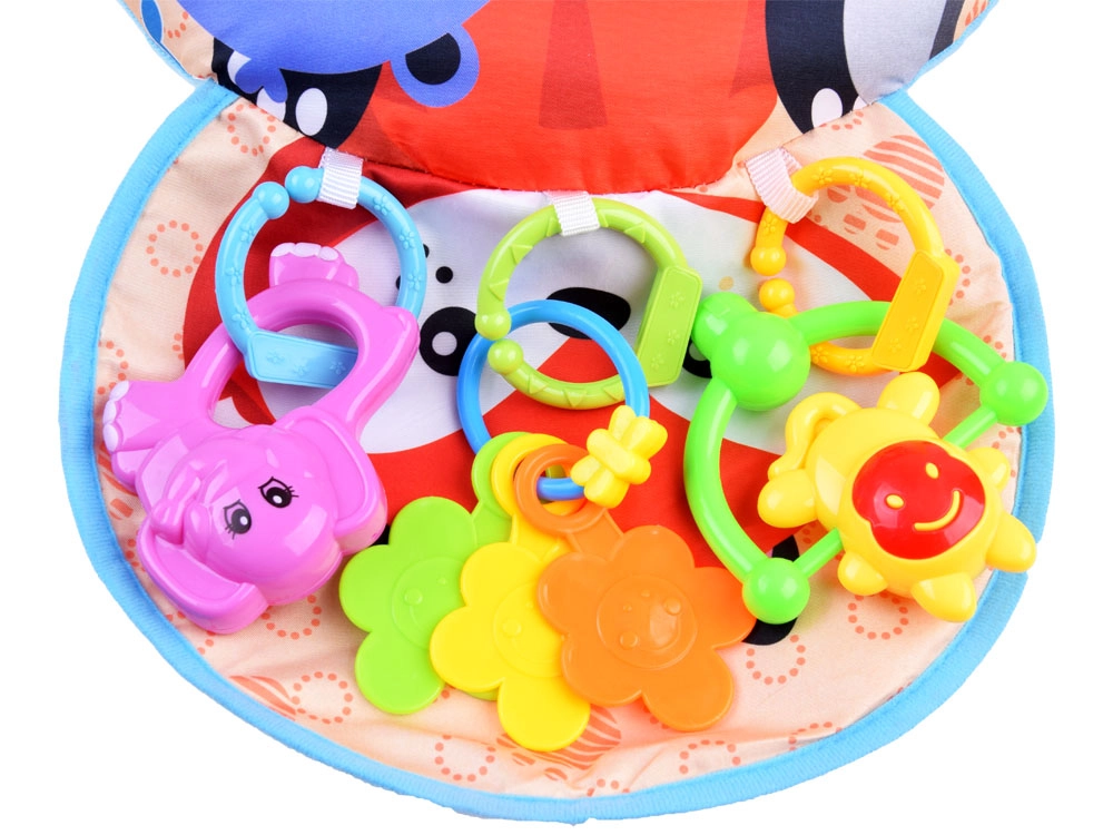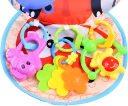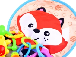 Шумолящата мини подложка и цветните дрънкалки развиват зрението, слуха и допира и подпомагат координацията на ръцете.