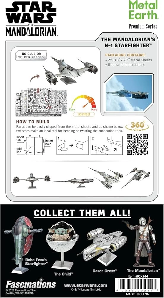 Този премиум комплект позволява на феновете на MANDALORIAN и моделистите да сглобят прецизна реплика на легендарния N‑1 Starfighter. От квадратни стоманени пластини оформяте и свързвате частите в впечатляващ метален модел с фино лазерно гравиране, което вярно пресъздава оригиналния вид на кораба.