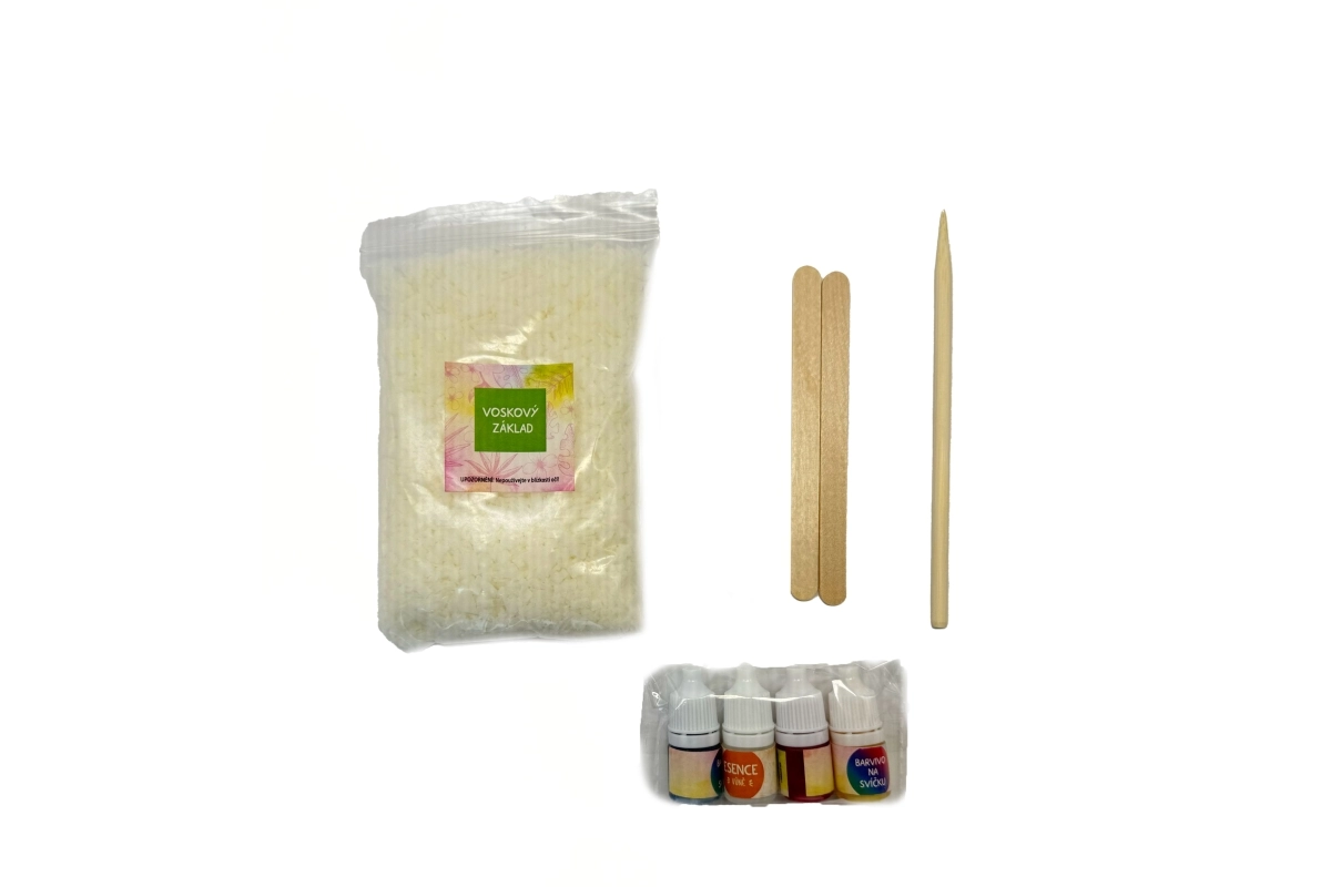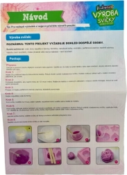 - Восъчна основа, форма, боя, есенция, фитил, бъркалка, дървени пръчки, инструкция