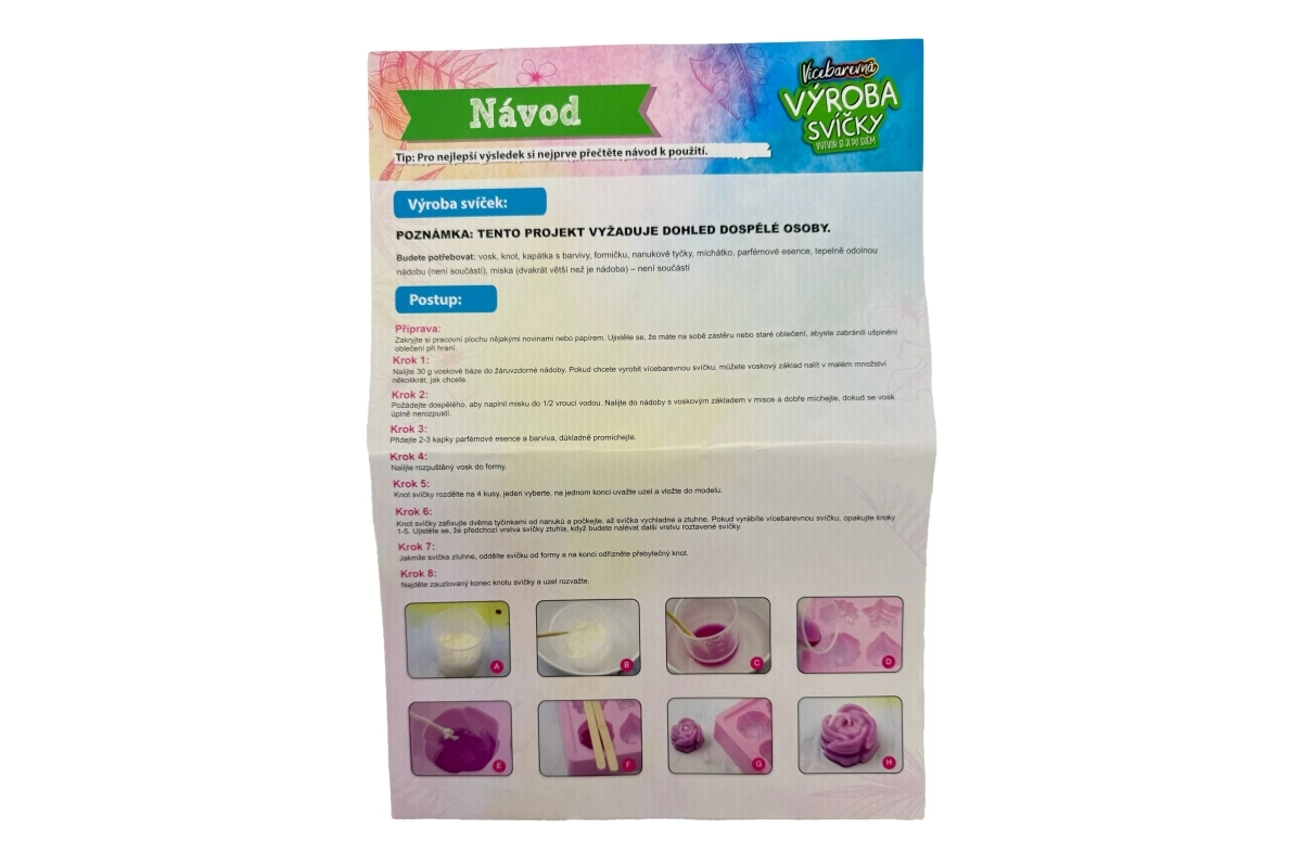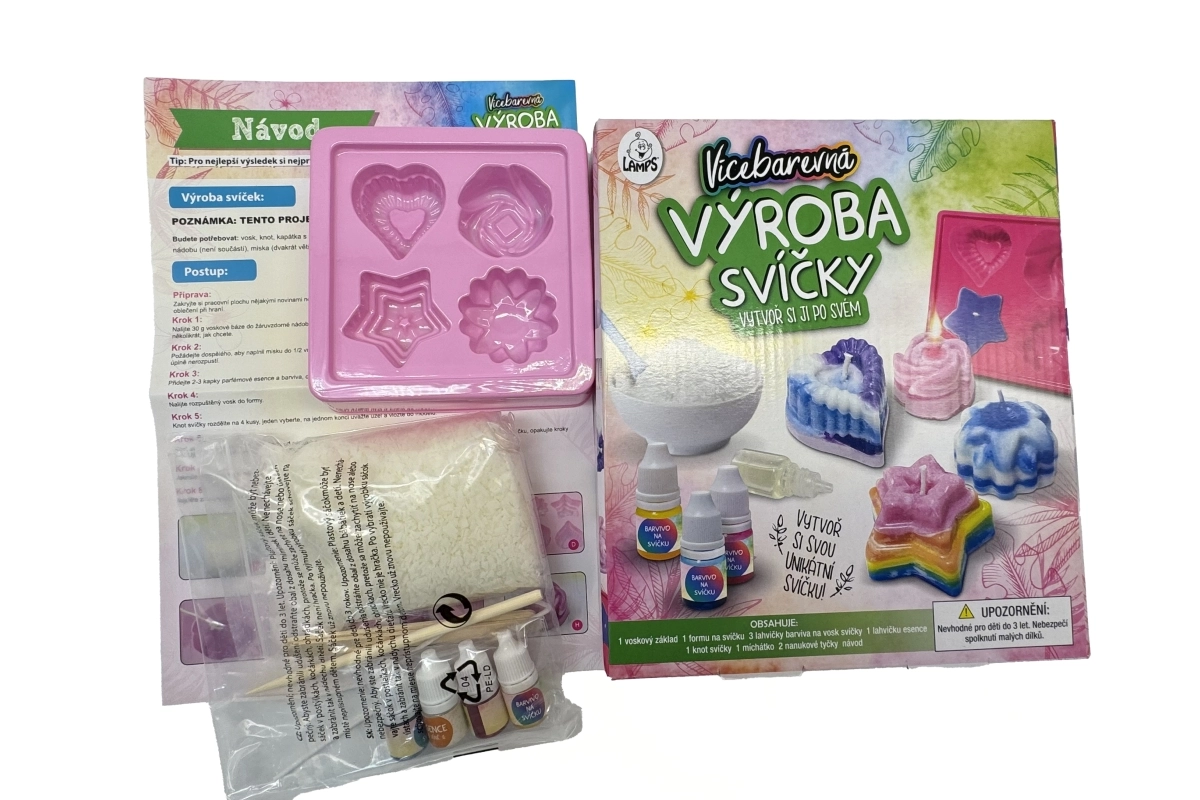 От восъчната основа, през боята и есенцията, до формата и фитила – децата могат да започнат да творят веднага след разопаковане.