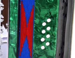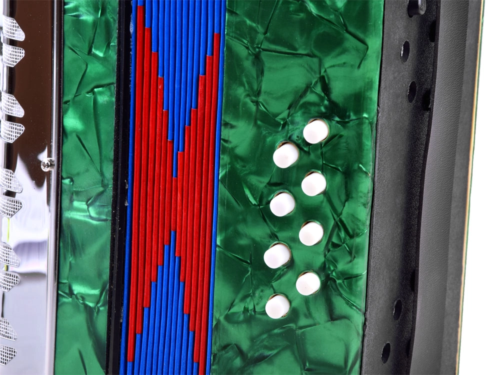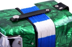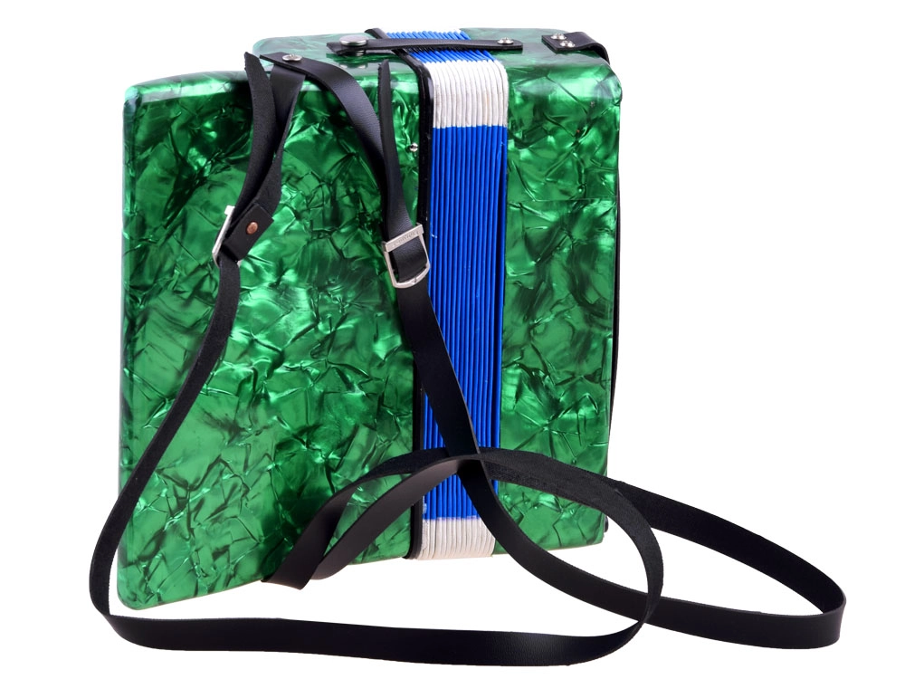 Благодарение на компактните размери (около 23 × 23 × 10 cm) и леката, преносима конструкция акордеонът лежи удобно в ръцете. Кожената раменна презрамка и дръжката за ръка осигуряват сигурен захват дори при по-дълга игра. Закопчалката на мяха предпазва инструмента по време на пренасяне и съхранение.