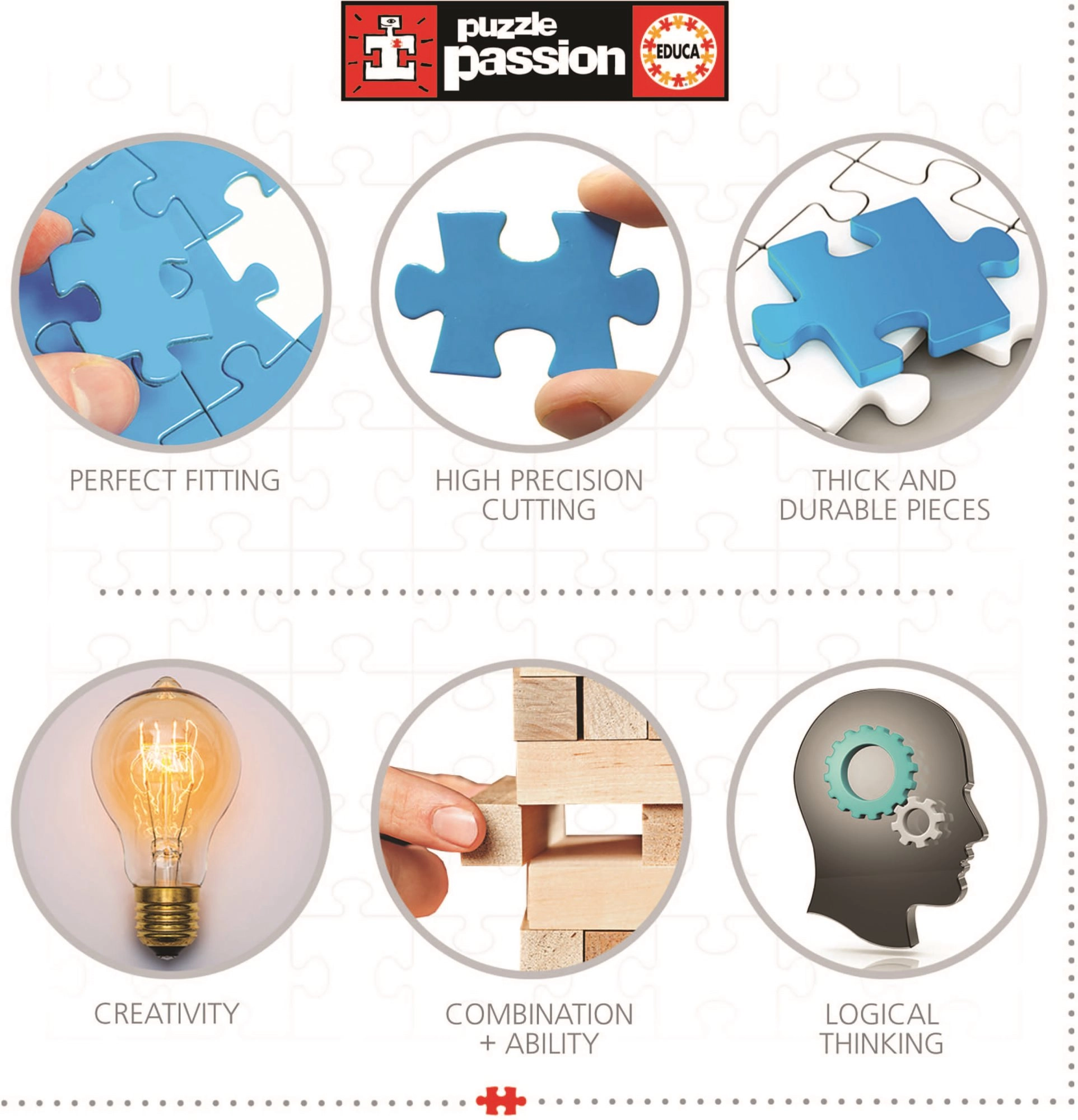Пренесете се на зеления остров и подредете впечатляващата Катедрала в Коб. Пъзелът на EDUCA предлага балансирано предизвикателство както за начинаещи, така и за опитни подреждачи, качествен печат и приятна повърхност на частите за комфортно подреждане. В комплекта има и безплатно лепило, благодарение на което лесно ще запазите готовото произведение.