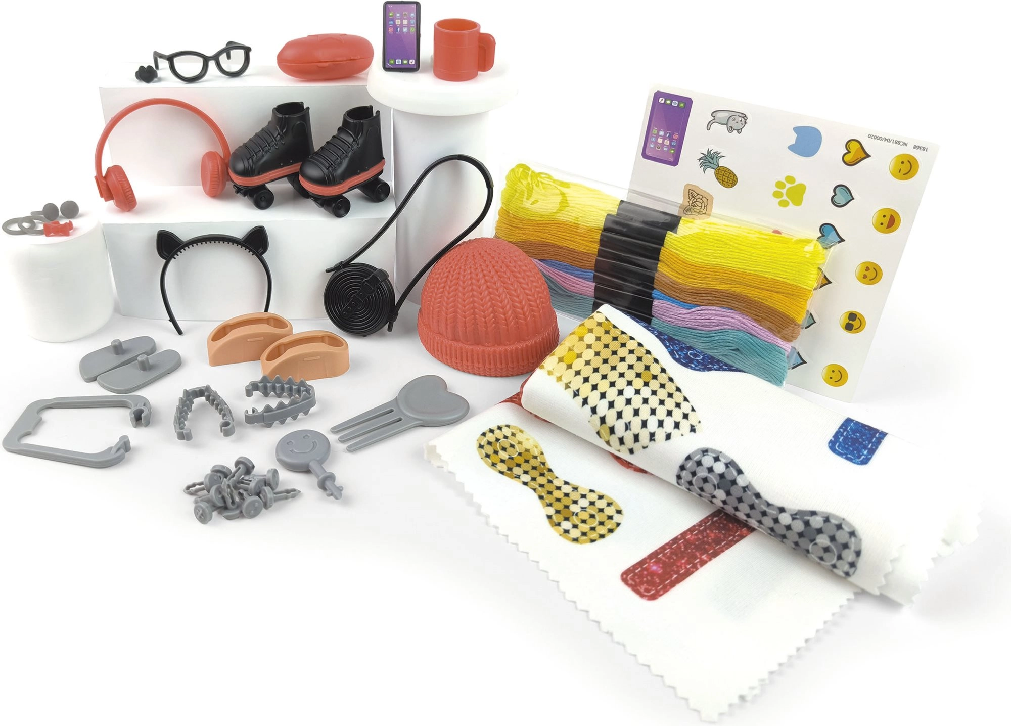 - Сглобяема кукла, плат с предпечатани кройки 61 × 32 см, модни аксесоари, конци за коса, перфоратор за облекла, аксесоари, илюстрирано ръководство