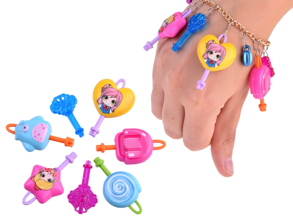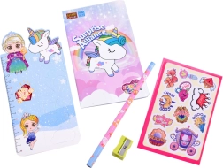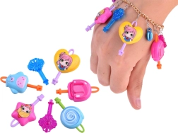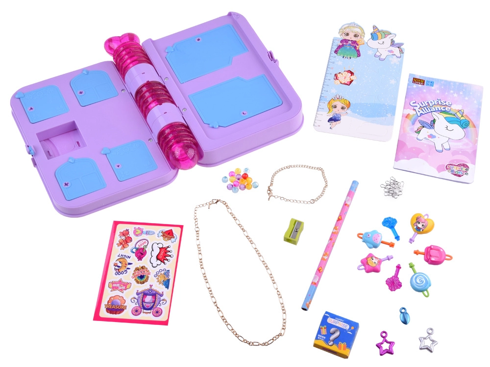 - 7 ключа; молив; острилка; верижка; 2 висулки за гривни; цветни мъниста; верижка за гривна; украса – сгъваемо сърчице; кукички; висулки; стикери; тетрадка; картонен линийка с принцеса; разделител с еднорог