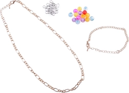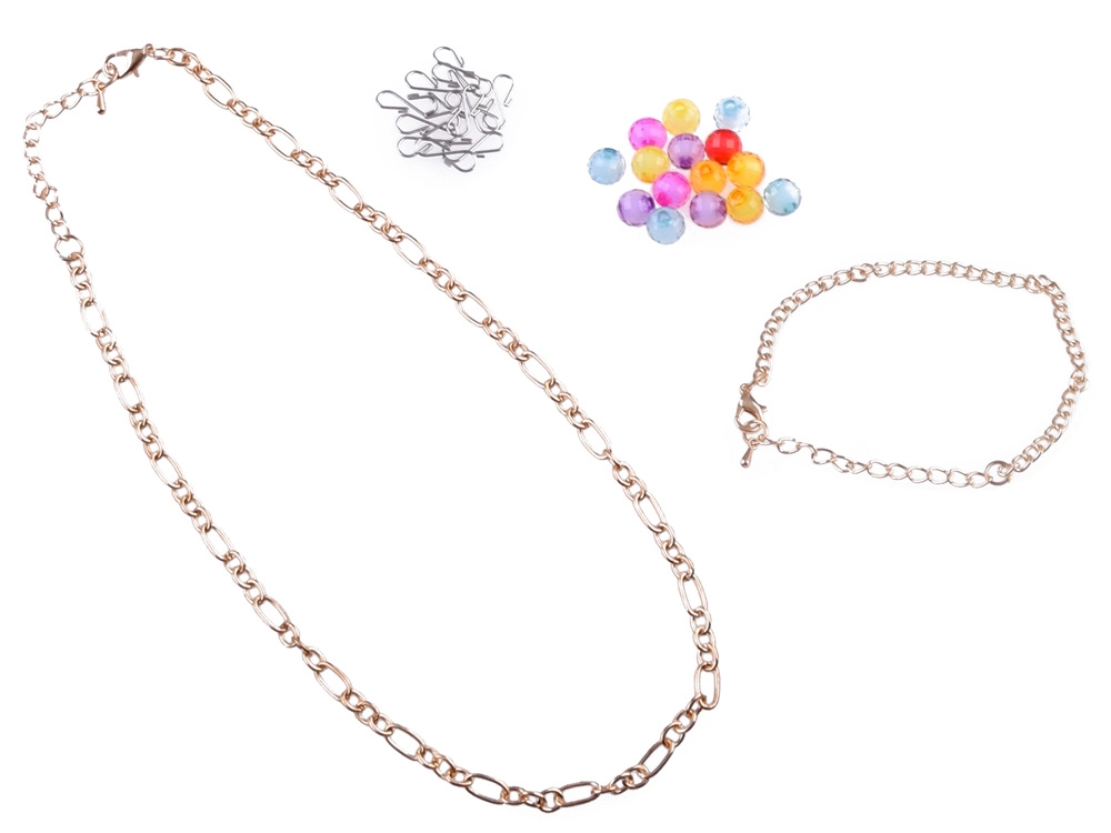 Включени са тетрадка, стикери, молив и острилка, както и мъниста, верижки и висулки за изработка на собствени гривни.