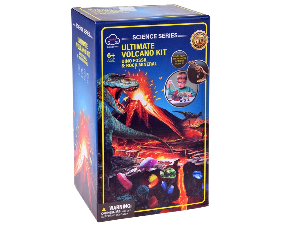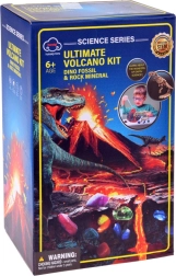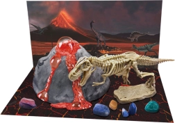 Включва отлят модел на вулкан, смеси за химична реакция (лимонена киселина и натриев хидрогенкарбонат), практични инструменти за копаене и почистване на находките и илюстрирано ръководство. В кратера се случва реалистична „лавова“ реакция, а вътре в модела децата ще открият цветни минерали и скелет на динозавър за сглобяване.
