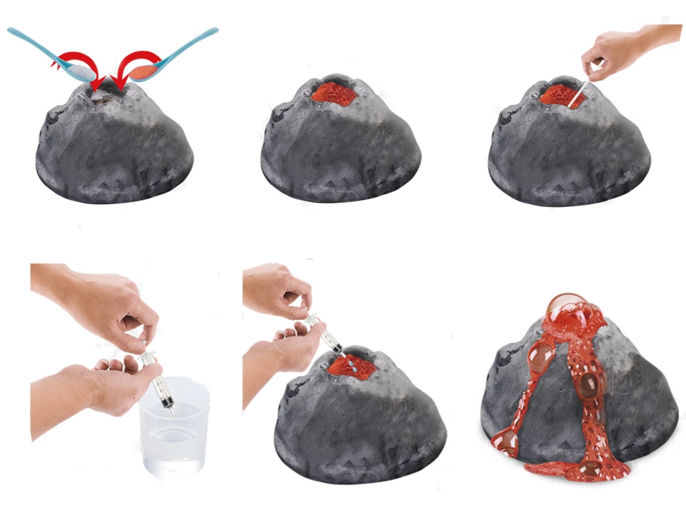 - отливка на вулкан, плик с лимонена киселина, плик с натриев хидрогенкарбонат, мерителна лъжичка, спринцовка, бъркалка, мерителна чашка, чукче, длето, четчица, картон с илюстрация на вулкан, илюстрирано ръководство (описание на английски)