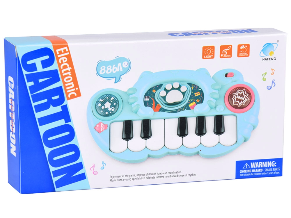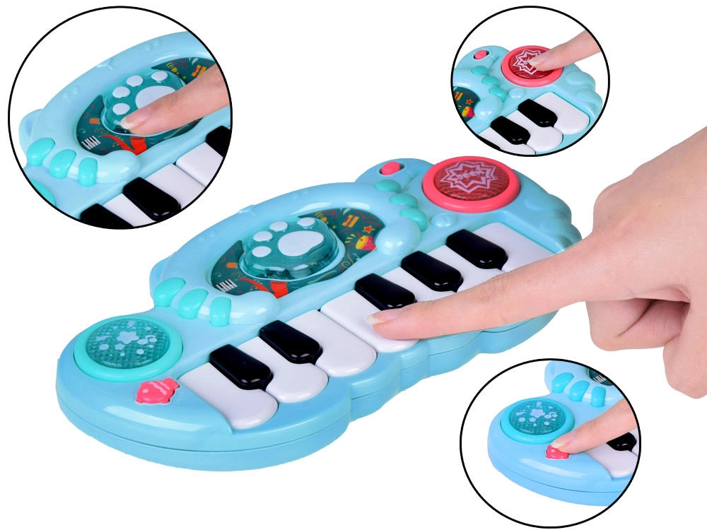Благодарение на няколкото игрови режима децата могат да превключват между звук на барабани и чинели, кратки весели мелодии и свирене на основни тонове от гамата върху черно-белите клавиши. Пианчето развива слуха, зрението и фината моторика – идеално за първи музикални стъпки.