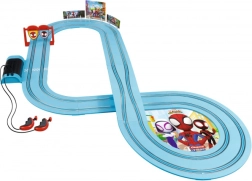 Детската автодраха CARRERA FIRST с мотив Спайди и неговите супер приятели предлага 2,9 м забавно каране за малки състезатели от 3 години. Батерийното трасе включва прави участъци, завои и арки за динамични преминавания, две детайлно изработени колички Spidey и Spin и лесен монтаж благодарение на системата със скоби. Благодарение на магнити и контактни четчици автомобилите прилепват отлично към трасето, а с до 6 часа каране на батерии забавлението е дълготрайно.