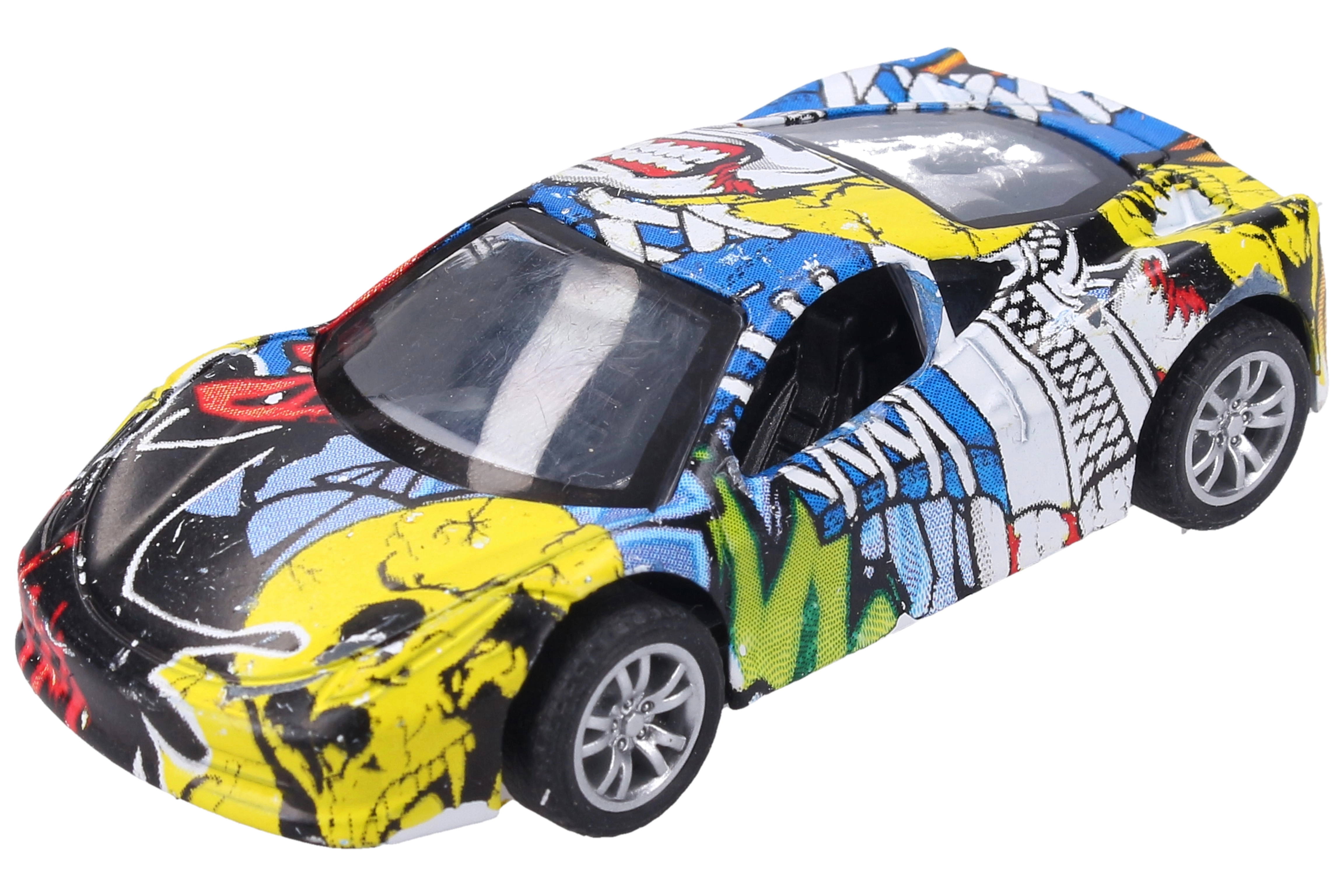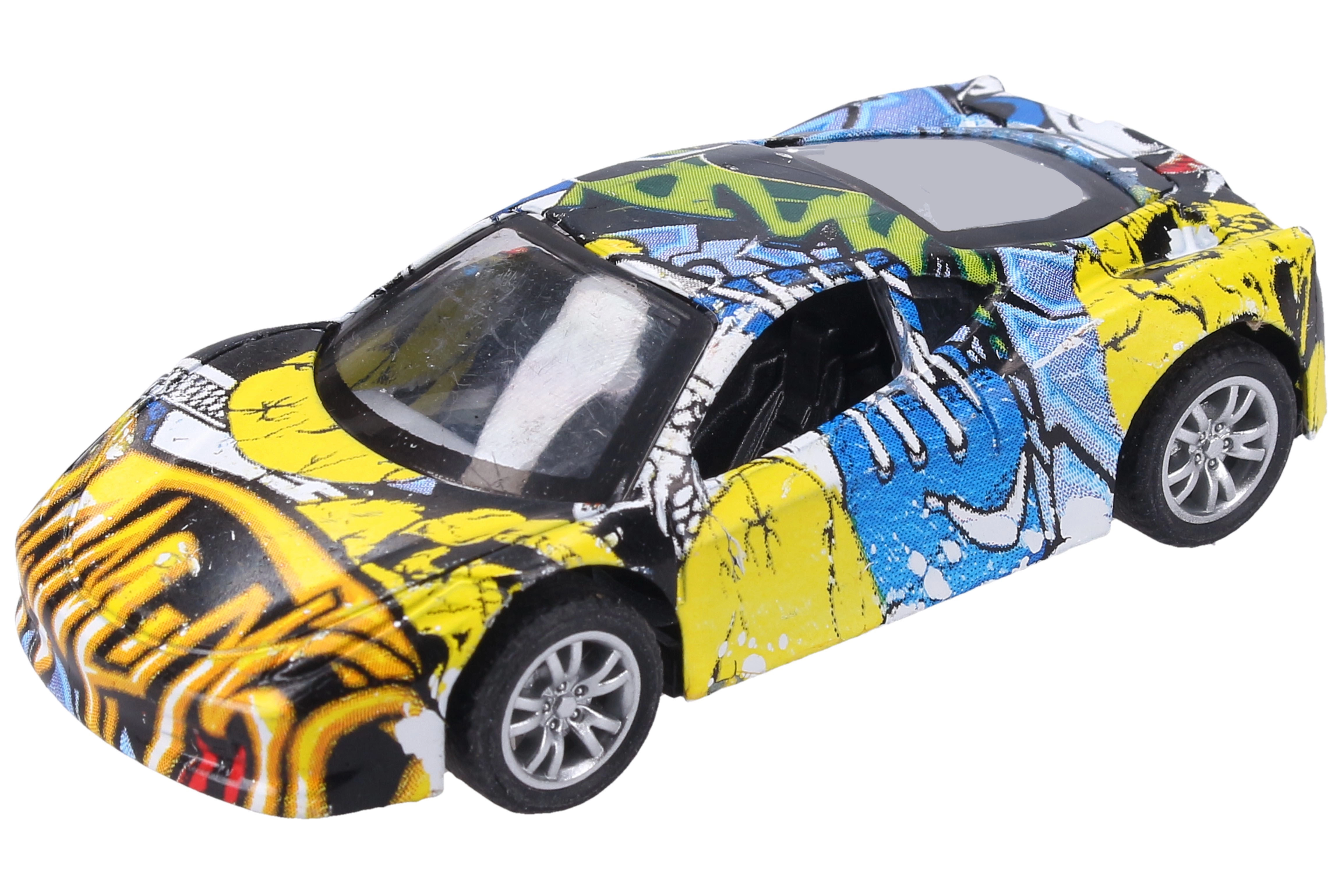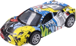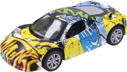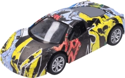 Стилно метално автомобилче с оригинален дизайн с графити, което ще зарадва малки и големи колекционери. Компактният размер 9 см, задният навиващ механизъм и 3 различни варианта го правят отличен избор както за игра, така и за колекция.