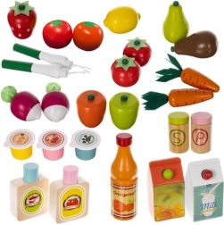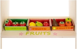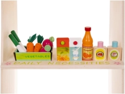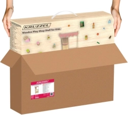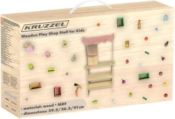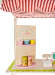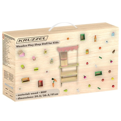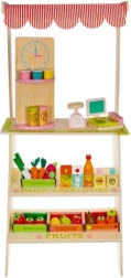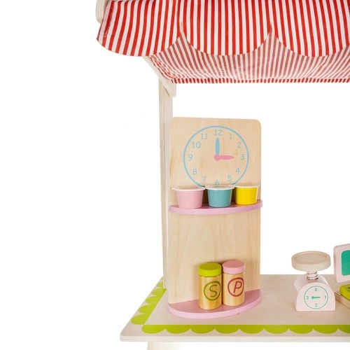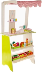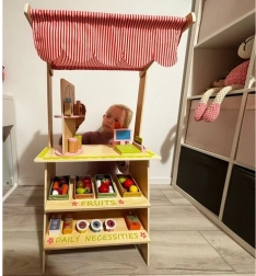 Подарете на децата собствен пазар! Стилен дървен щанд с покрив в раиран дизайн, рафтове и обозначени секции за плодове и ежедневни нужди развива въображението, общуването и фината моторика. Реалистичните аксесоари – каса със скенер, платежна карта, везна и въртяща се дъска/„часовник“ – превръщат всяка покупка във вълнуващо приключение.