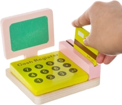 Каса със скенер, везна, въртяща се дъска и много дървени хранителни продукти – всичко, от което децата се нуждаят, за да отворят собствен магазин и да тренират социални умения.
