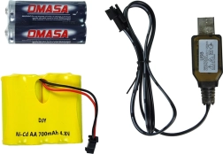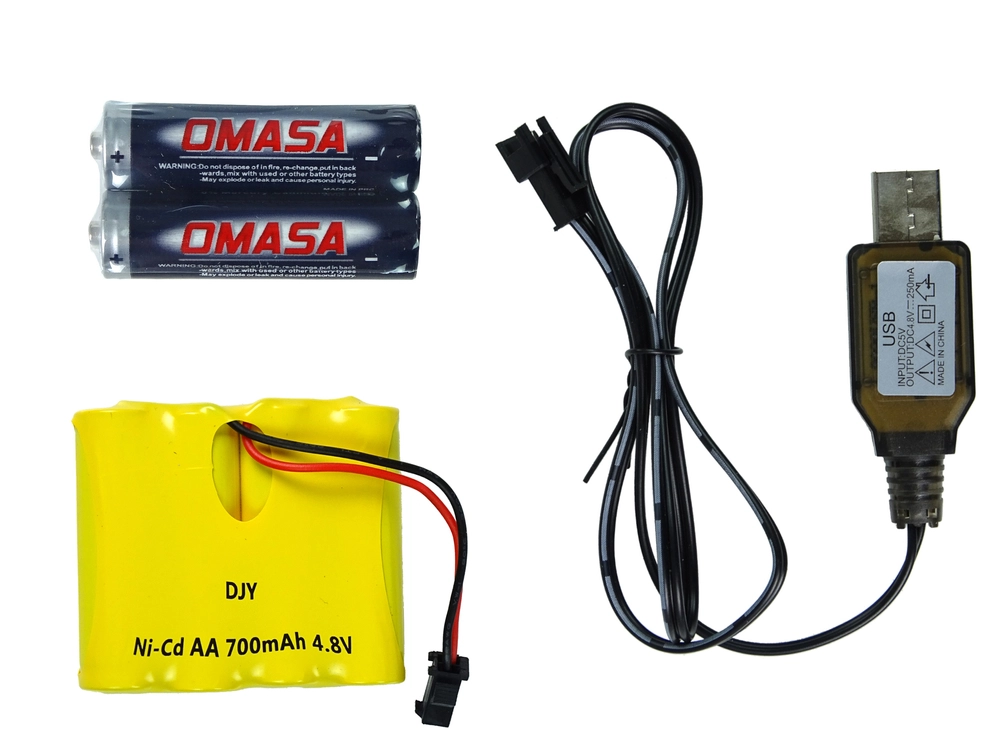 В комплекта ще намерите колата, контролер, презареждаща се батерия 4,8 V 700 mAh, 2× AA батерии и USB зарядно – просто включвате и тръгвате.