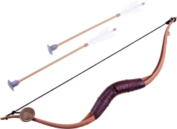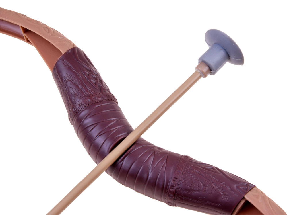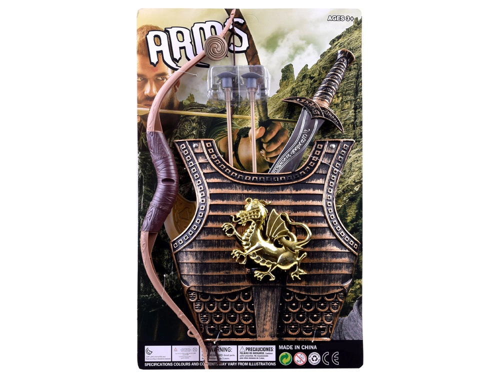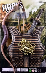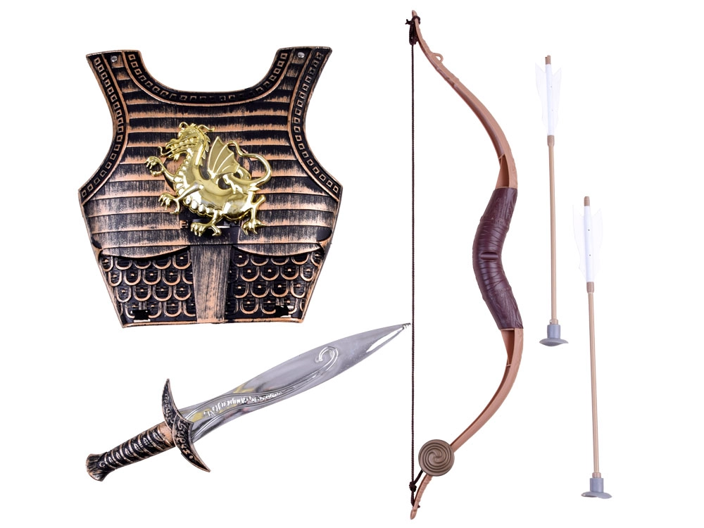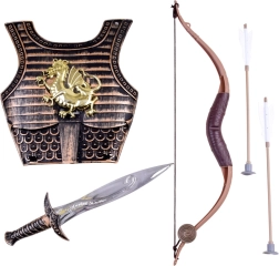 Комплектът включва броня, лък, две стрели и меч – идеална комбинация за фантастични битки и карнавални костюми.