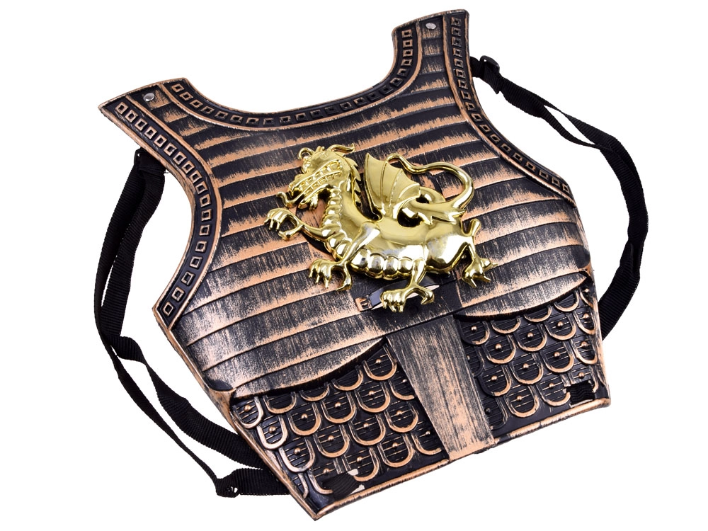 Тази пълна рицарска екипировка е идеална за домашни приключения, карнавали и детски празненства. Бронята с ярък златен дракон стои удобно благодарение на регулируемите презрамки, лъкът с две безопасни стрели с вендуза ще зарадва малките стрелци, а лекият меч допълва всяка героична мисия.