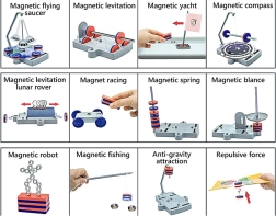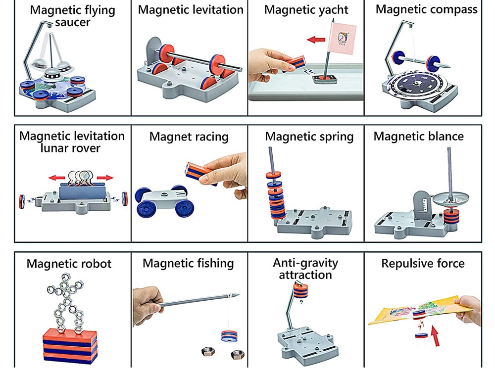 В комплекта са включени цветни магнити, пластмасови основи и аксесоари, с които могат да се създават тематични проекти – например махаловидно НЛО, магнитно возило или фигурка от метални гайки. Благодарение на прегледните елементи сглобяването е лесно и безопасно, идеално за домашно обучение и училищни кръжоци.