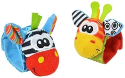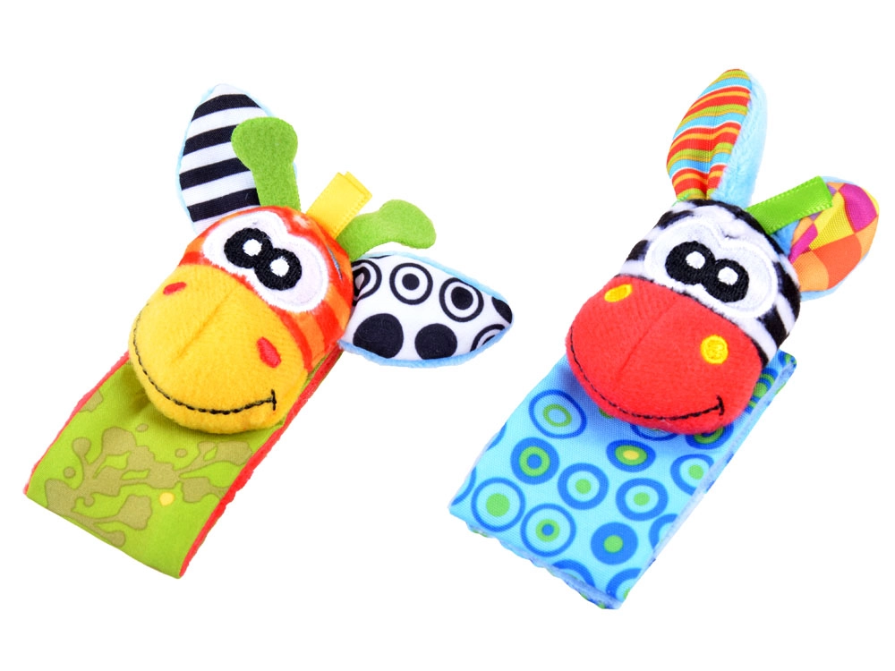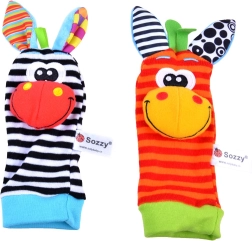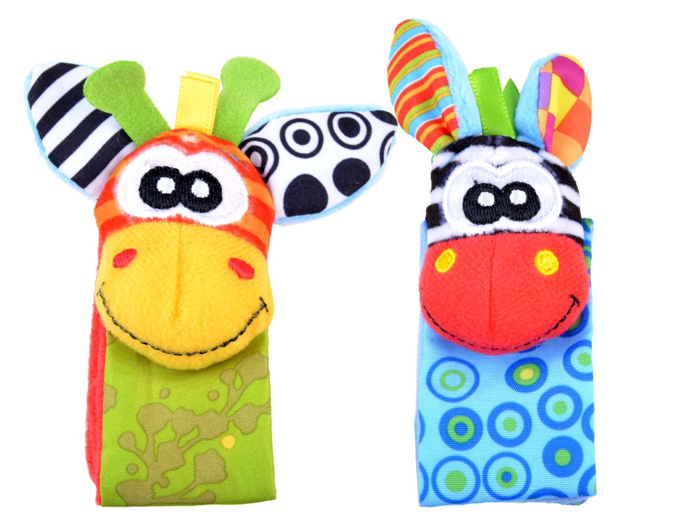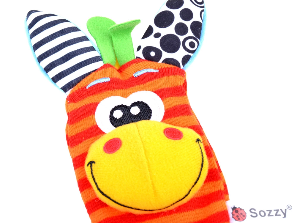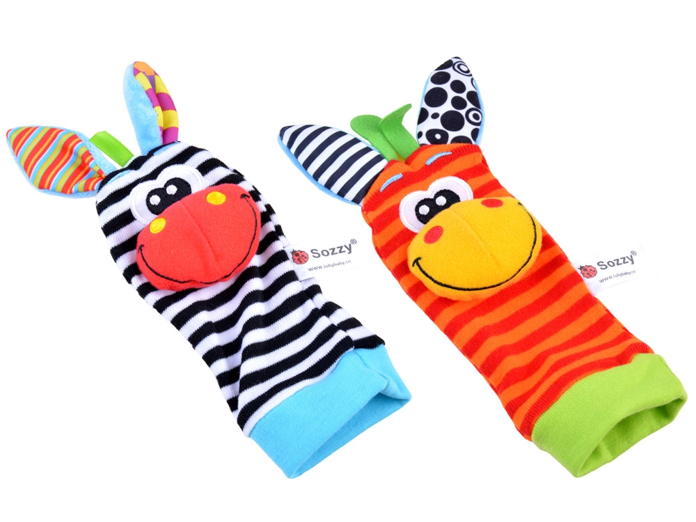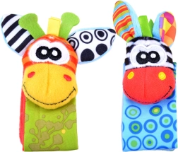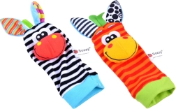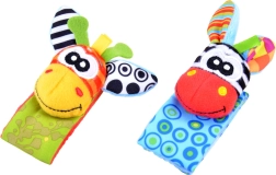 Чорапките дрънкат и едновременно топлят, гривните за китки се закрепват лесно благодарение на велкро закопчаване и стоят стабилно дори при буйни движения. Бродираните личица на животинките са напълно безопасни без дребни части. Играчките могат да се перат, което улеснява поддържането на чистота – идеален избор за ежедневно играене и като подарък за новородено.