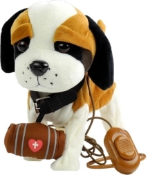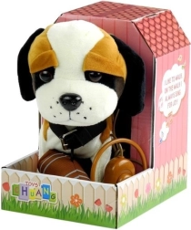 Интерактивният кафяво-бял сенбернар на каишка е направен от мек и екологично щадящ материал, приятен на допир. Оборудван е с големи тъмни очи, повдигната опашка и изразителен нос. Играчката има дълга каишка с превключвател, чрез която детето лесно може да управлява своето животинче. Кученцето танцува и пее, което добавя забавление и реализъм към играта.