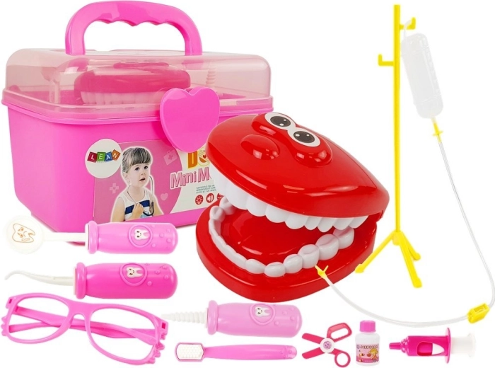 Открийте забавния детски лекарски комплект за малкия зъболекар, който помага да се преодолее страхът от кабинета и насърчава креативната игра. В практичното куфарче ще намерите зъболекарски инструменти, капацитивна стойка, спринцовка, бормашини и зъби с челюст за безопасно трениране на грижата за усмивката. Леката, устойчива пластмасова конструкция и приятелските форми са идеални за деца от 3 години.