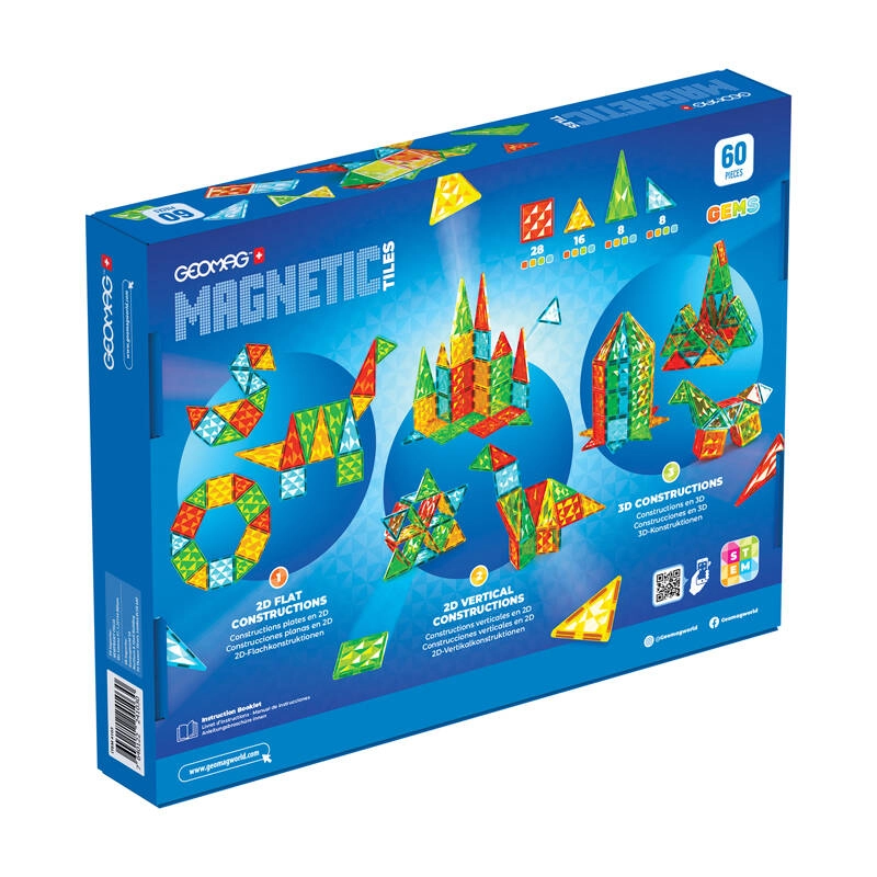 Магнитният конструктор Geomag Gems Rocket 60 предлага 60 цветни прозрачни плочки, които благодарение на силните магнити се свързват лесно. Децата създават ракети и оригинални 3D постройки, като едновременно развиват фината моторика, пространственото въображение и STEM уменията. Подходящо от 3 години.