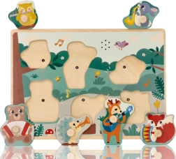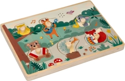 Тази дървена звукова влога с горски мотив предлага на децата първа среща с музикални инструменти по игрив начин. Всеки цветен елемент с животинче има практична дръжка за лесно държане и при поставяне на правилното място прозвучава съответният звук, който мотивира за повторна игра и откривателство.