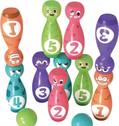 В комплекта има 10 кегли, всяка с различно лице и в различни цветове, което привлича вниманието на децата и ги насърчава към игра. Освен това кеглите имат сплескани върхове, което позволява да се подреждат една върху друга и да се създават цветни кули. Така детето може да се радва не само на традиционната игра на кегли, но и на креативното подреждане на кеглите.