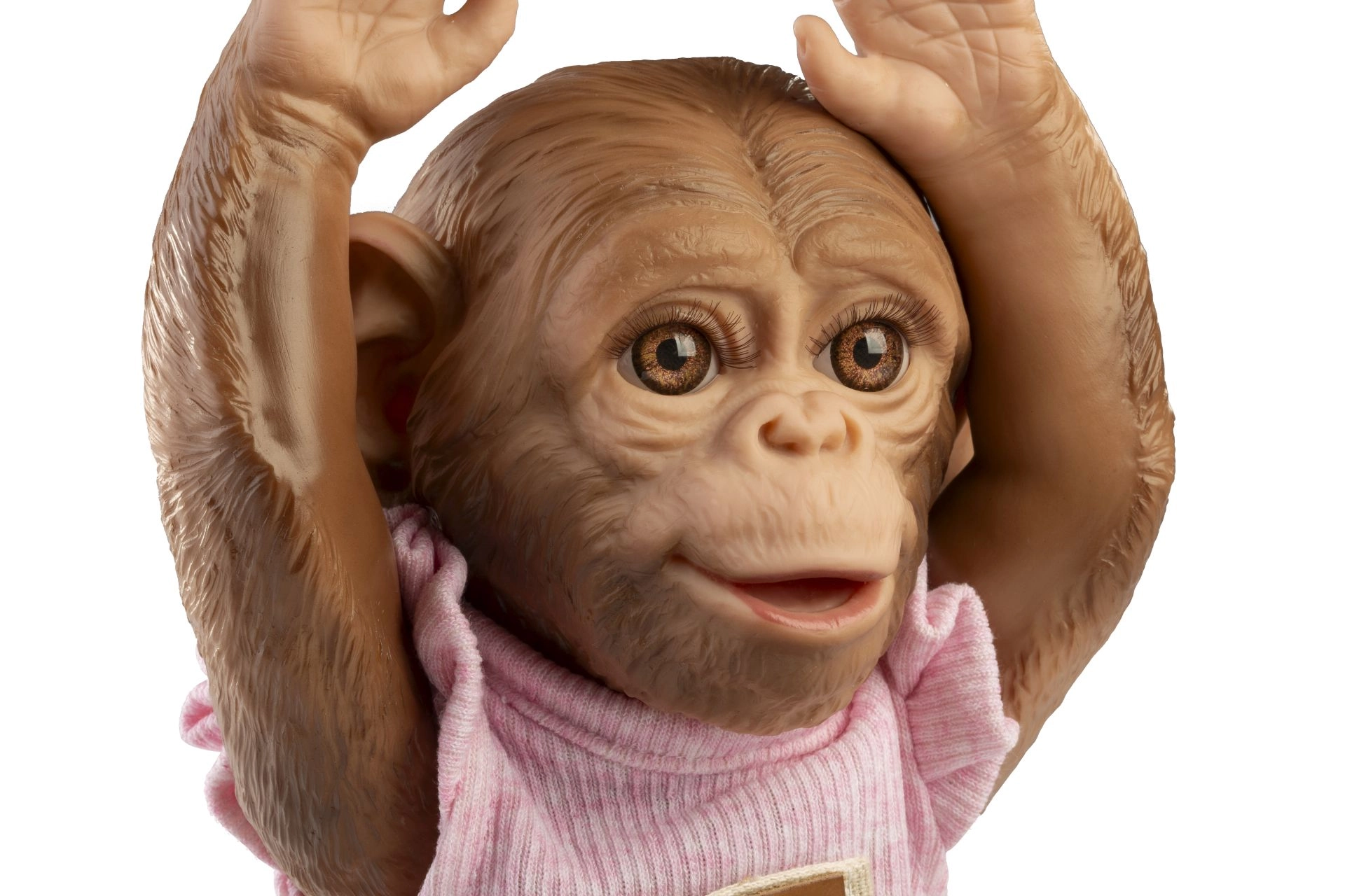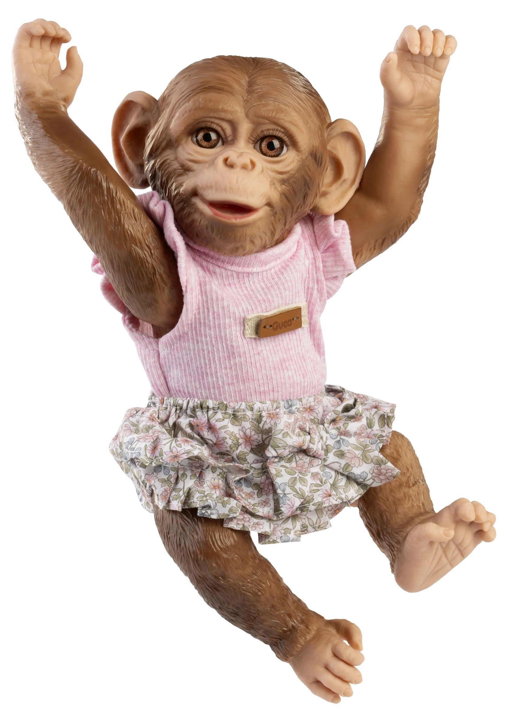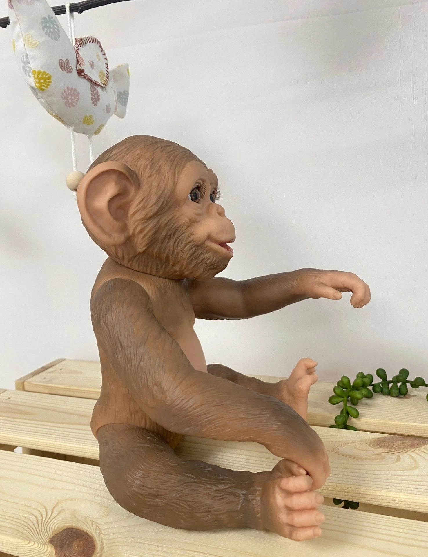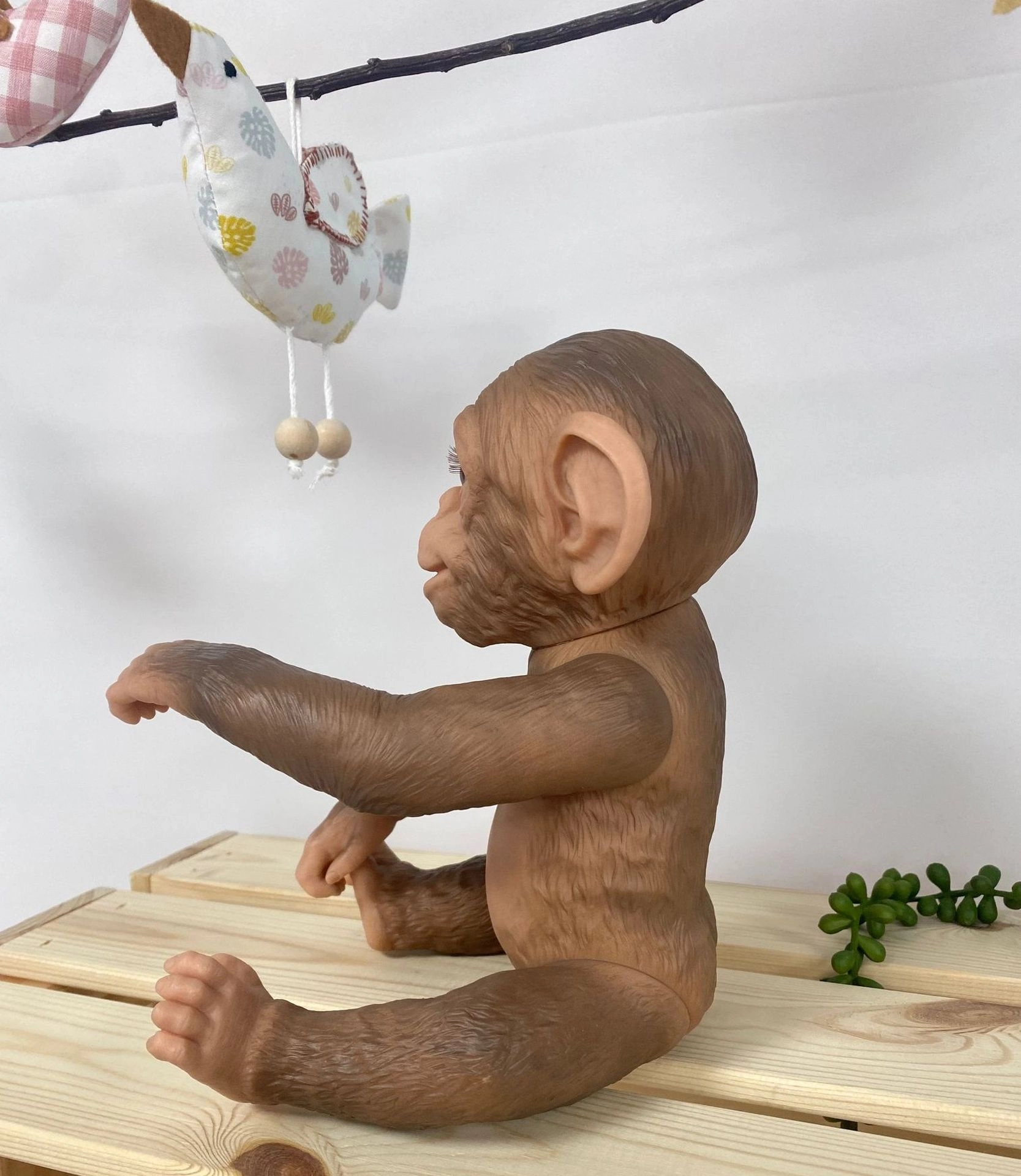 Това реалистично reborn маймунче впечатлява с детайлна изработка на лицето, гънките и текстурата на „козината“ върху винила. Цялото винилово изпълнение позволява щадящо къпане (внимание с миглите), като полът не е обозначен. Крайниците са монтирани със шарнири, така че играчката лесно задържа пози – може да седи, да се хване или да се окачи за ръце или крака.