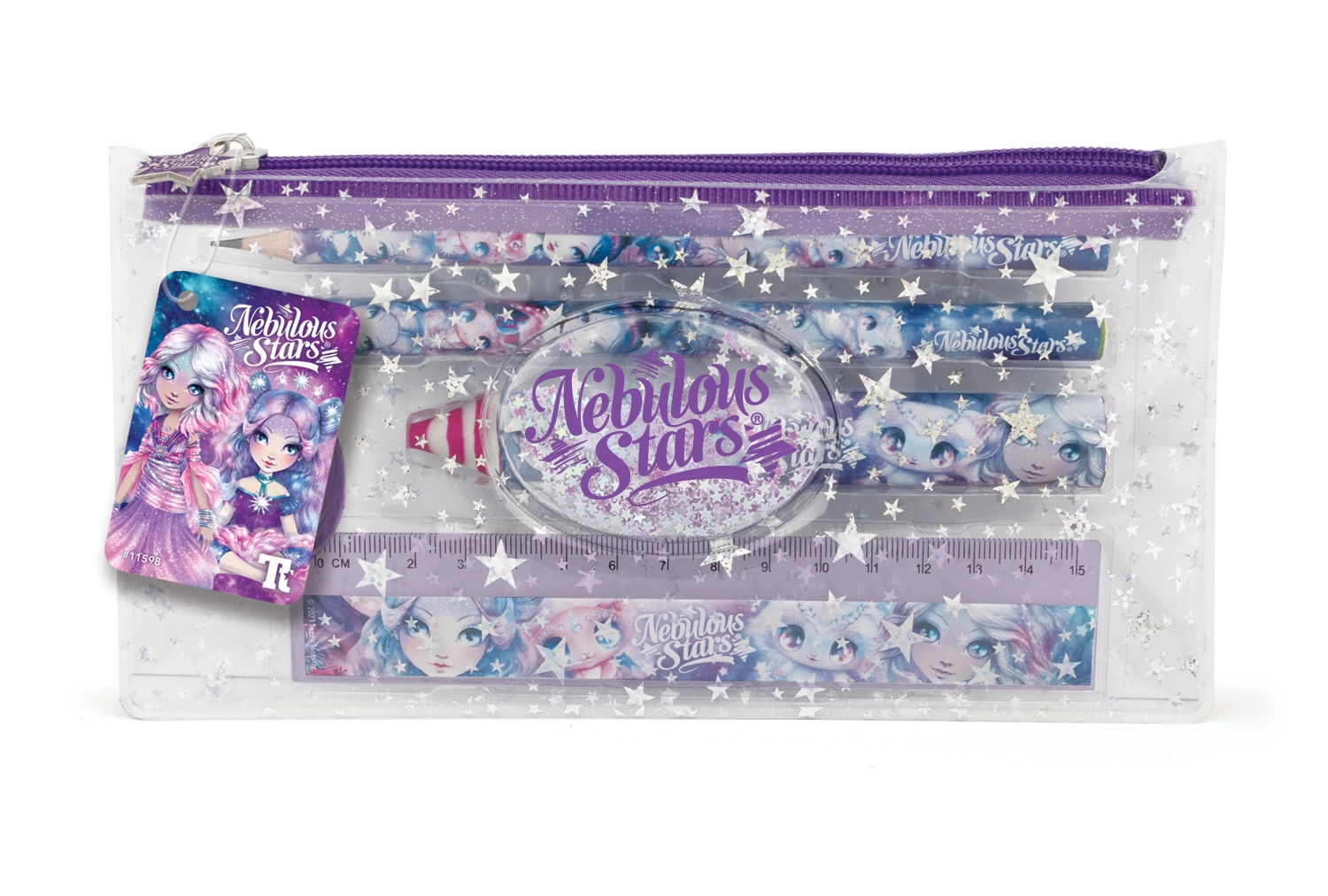 Креативният комплект за писане Nebulous Stars ще зарадва ученици и почитатели на сладки аксесоари. Включва несесер, дъгов молив, молив, гума, линийка и острилка – всичко в магически стил за удобно писане и творене.